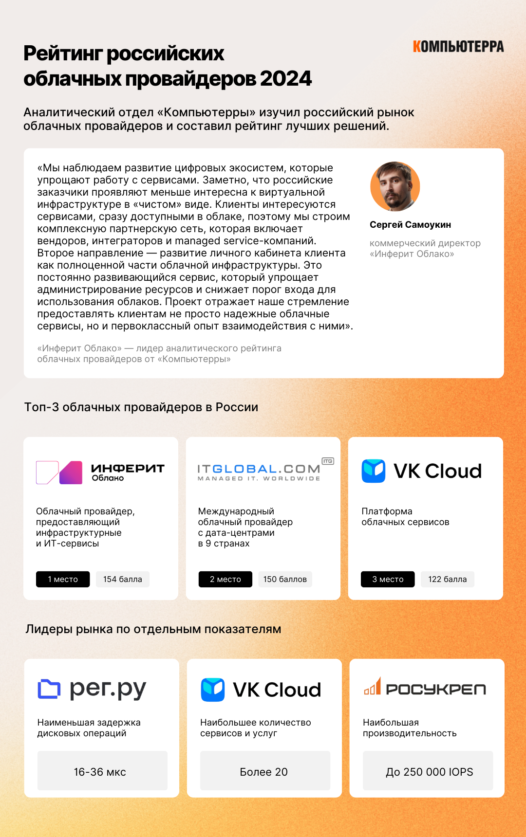 На лидирующей позиции рейтинга облачных провайдеров разместилось «Инферит Облако» от российского ИТ-вендора «Инферит», набрав 154 балла.