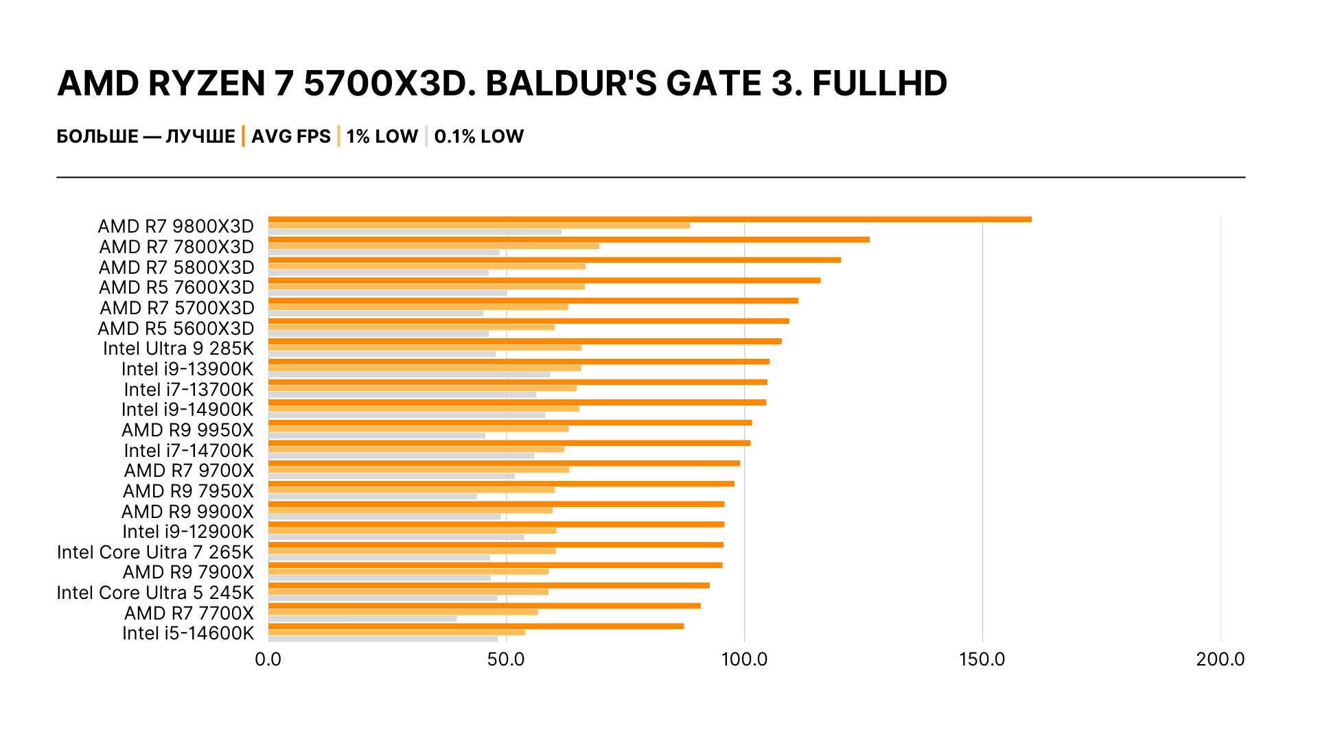 Крайне простая и понятная категория, в которой процессор отбирается по одному принципу: максимальный fps в играх. Здесь безоговорочный лидер — AMD Ryzen 7 9800X3D. В некоторых сценариях обходит предыдущего «короля» игровых бенчмарков AMD Ryzen 7 7800X3D на внушительные 26%.