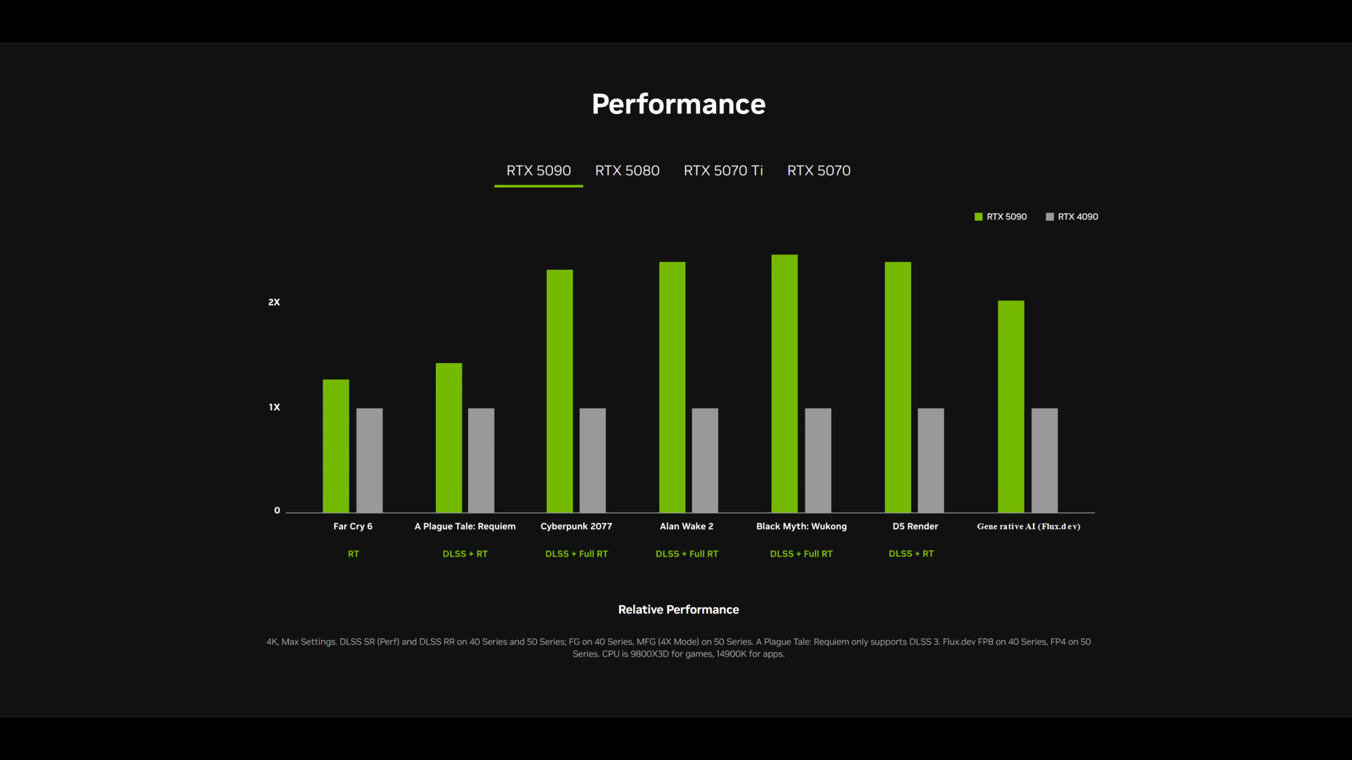 В сети ведутся ожесточенные споры относительно того, какой будет реальная производительность новых GPU. На данный момент опираться можно только на официальные слайды и неподтвержденные утечки. Если говорить о первых, то заявлено, что RTX 5090 до двух раз быстрее, чем RTX 4090, однако есть нюанс: подобные результаты достигнуты при использовании DLSS 3 для карты предыдущего поколения и DLSS 4 для новинки.