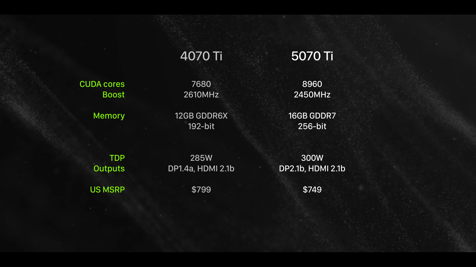 В сравнении с аналогом прошлого поколения RTX 5070 Ti получила более весомый апгрейд: на 17% больше CUDA-ядер, на 4 ГБ больше видеопамяти — теперь суммарный объем — 16 ГБ, на 164 МБ большую ширину шины. Теплопакет при этом вырос всего на 15 Вт.