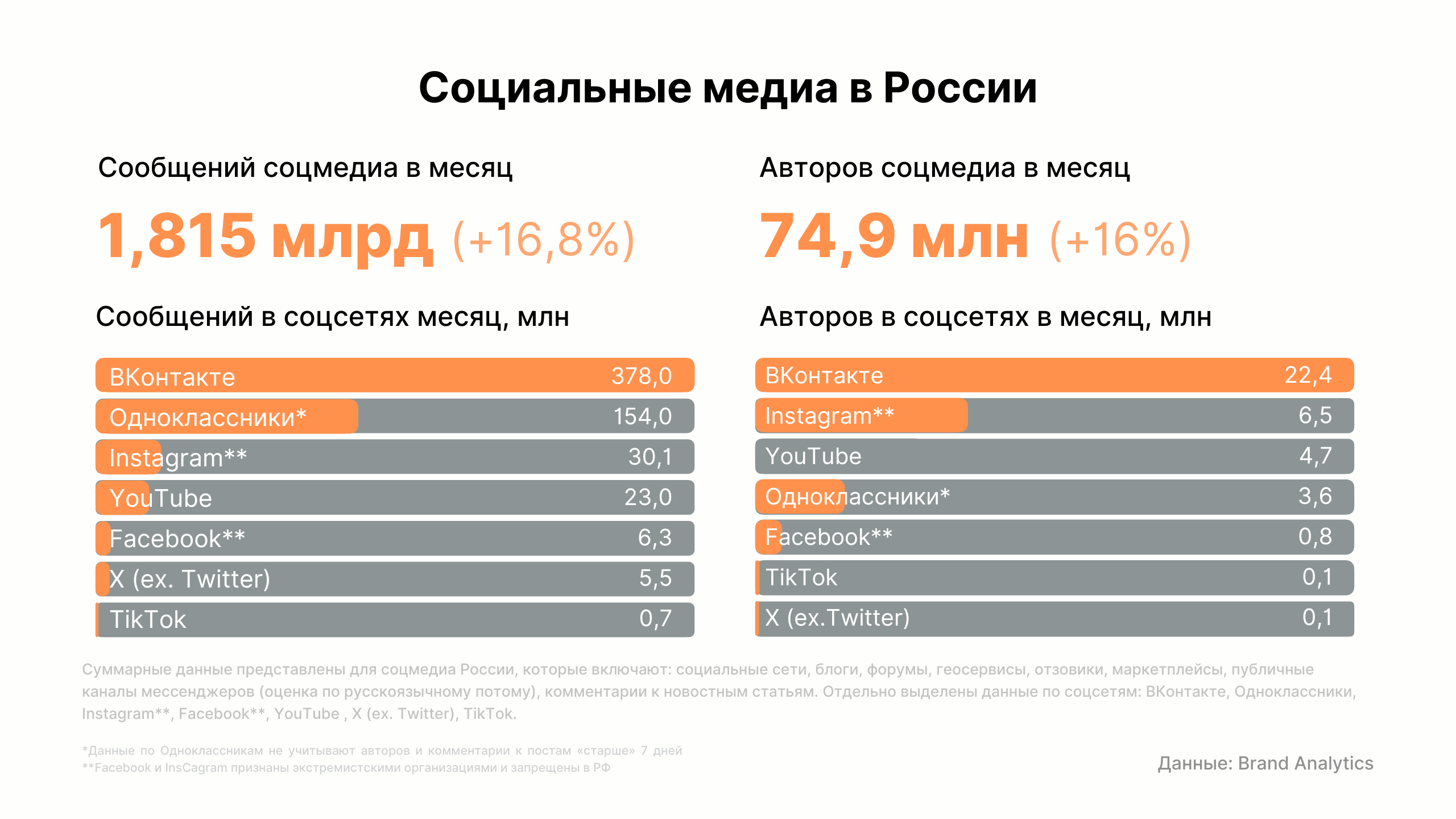 Согласно исследованию Brand Analytics, самой популярной соцсетью в России в октябре 2024 года и по количеству авторов, и по количеству публичных сообщений стала «ВКонтакте». Аналитики под термином «автор» подразумевают каждого пользователя, кто опубликовал хотя бы одно публичное сообщение за месяц. Публичное сообщение, в понимании авторов исследования, — любая публикация на стене, в блоге, статусе или комментариях. Личные сообщения здесь не учитываются.