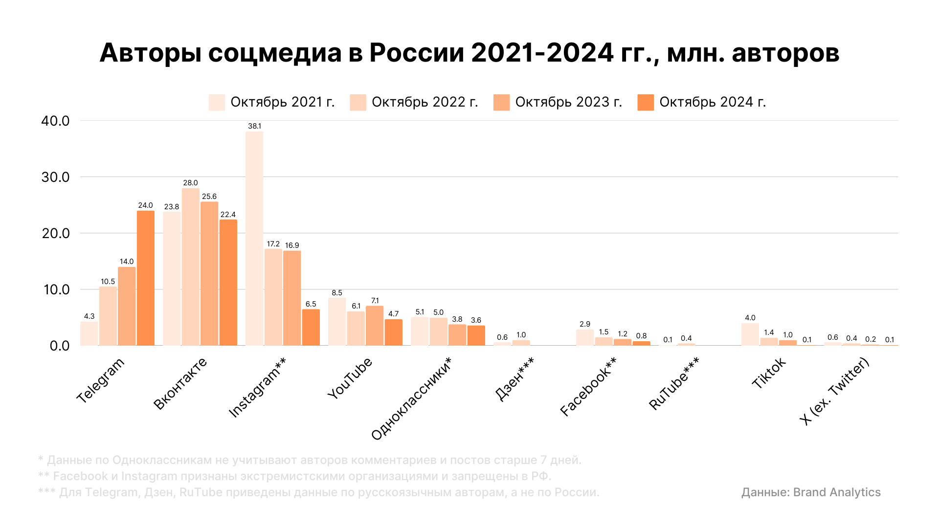 На YouTube число авторов с 8,5 млн в 2021 году упало до 4,7 млн в 2024-м; в «Одноклассниках» — с 5,1 млн до 3,6 млн; в Facebook* — с 2,9 млн до 0,8 млн; в TikTok — с 4 млн до 0,1 млн авторов.