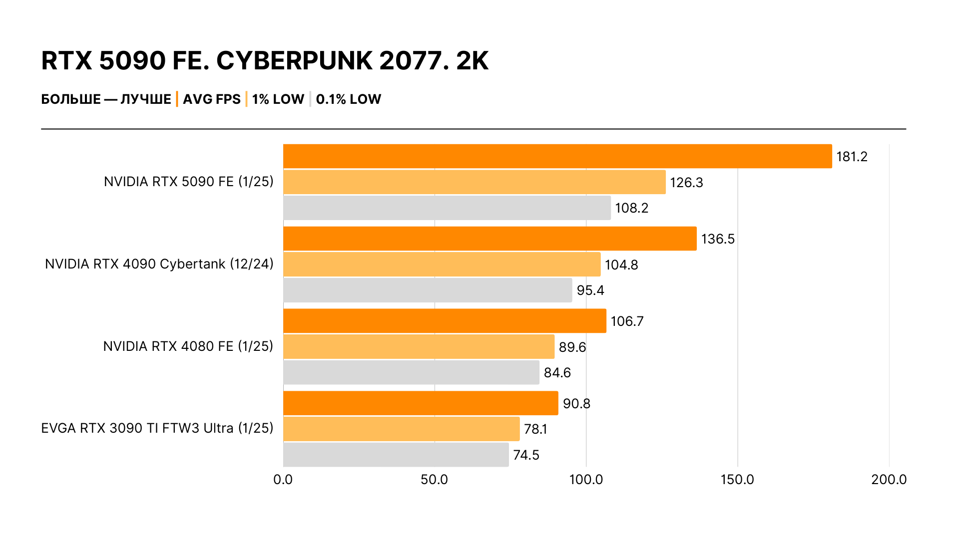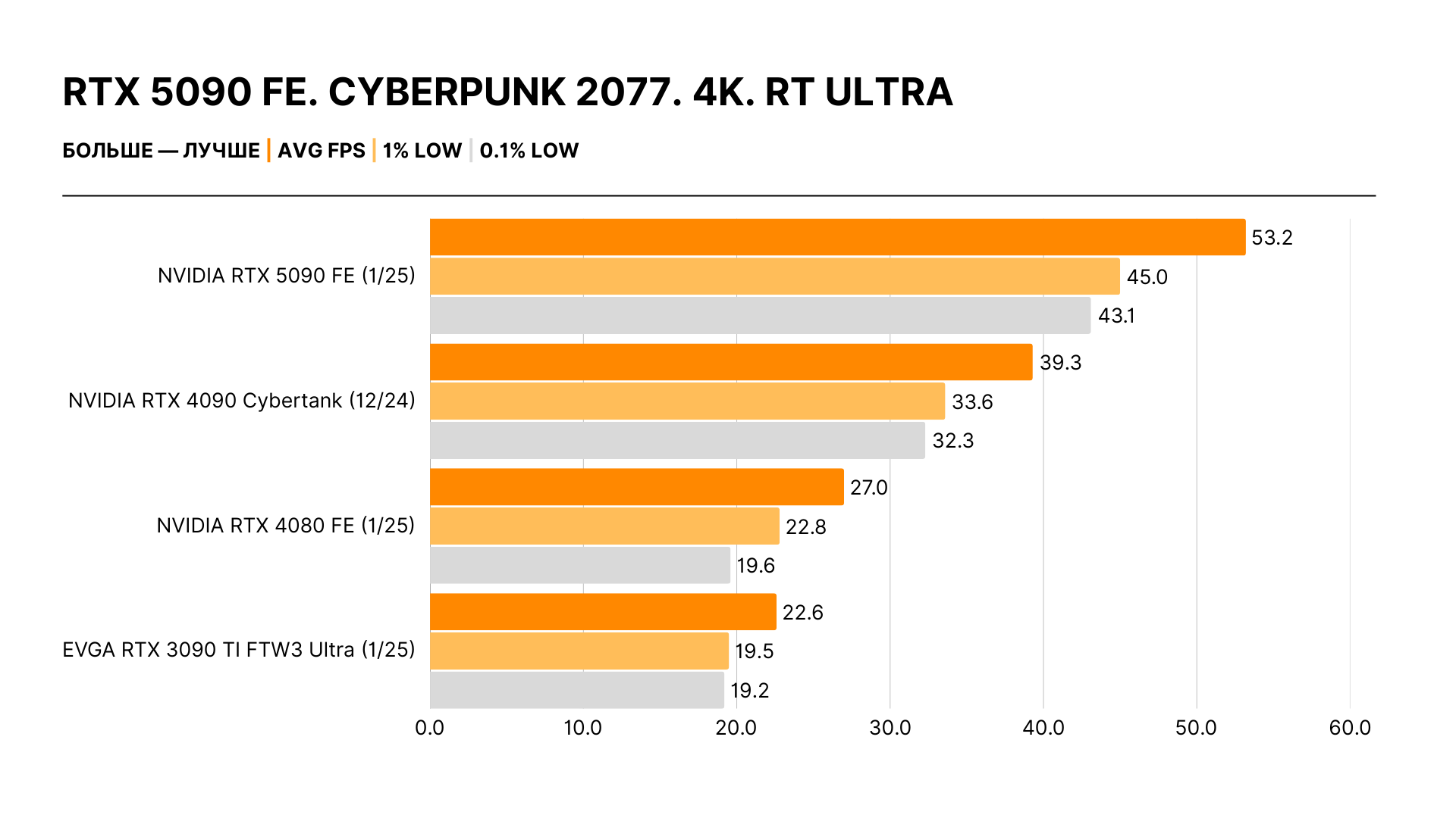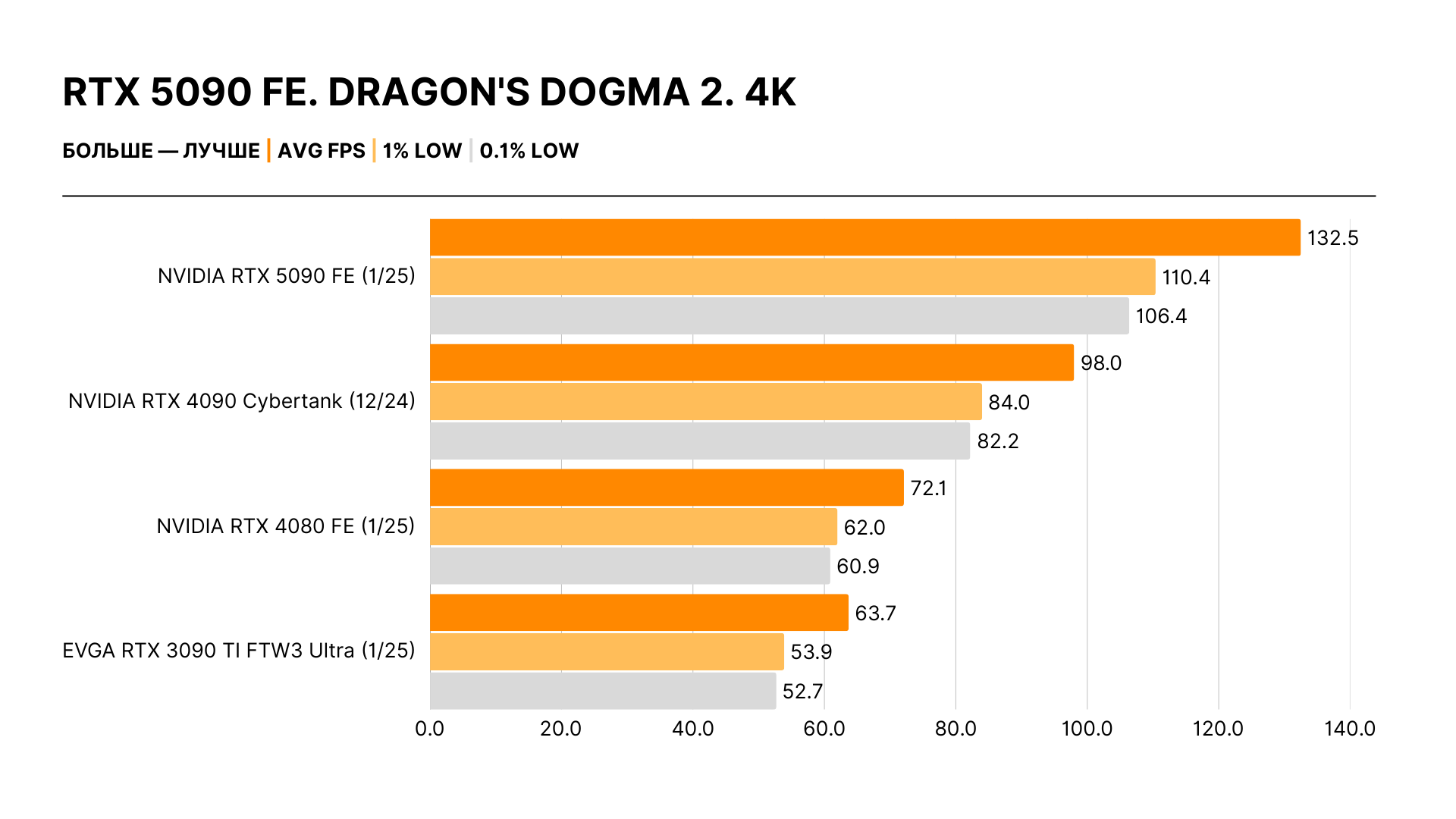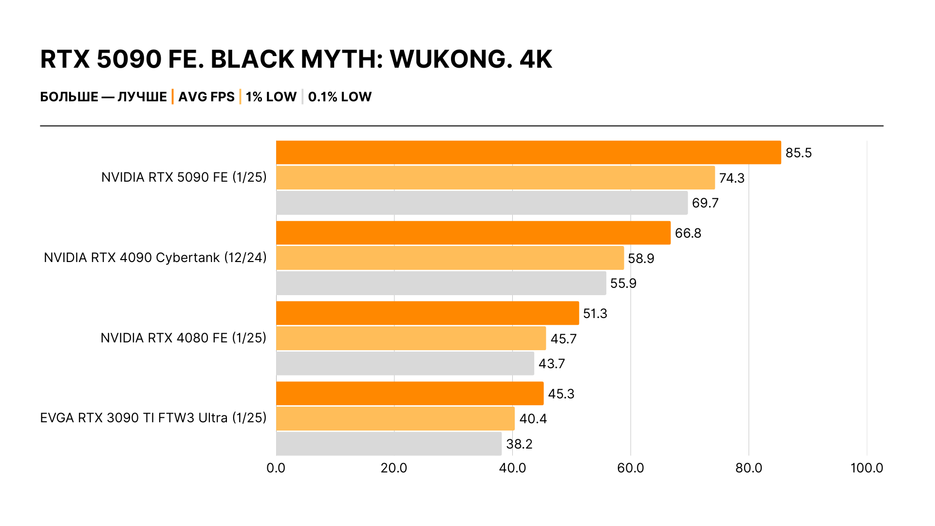 Увлеченные энтузиасты и скептики оказались правы: реальный прирост производительности не имеет ничего общего с обещаниями Дженсена Хуанга. Никакого двукратного отрыва нет: действительные цифры — в районе 30% в 4K относительно RTX 4090 и 20% в 2K в сравнении с ней же. Самый высокий зафиксированный результат — 40%, но это исключение из правил.