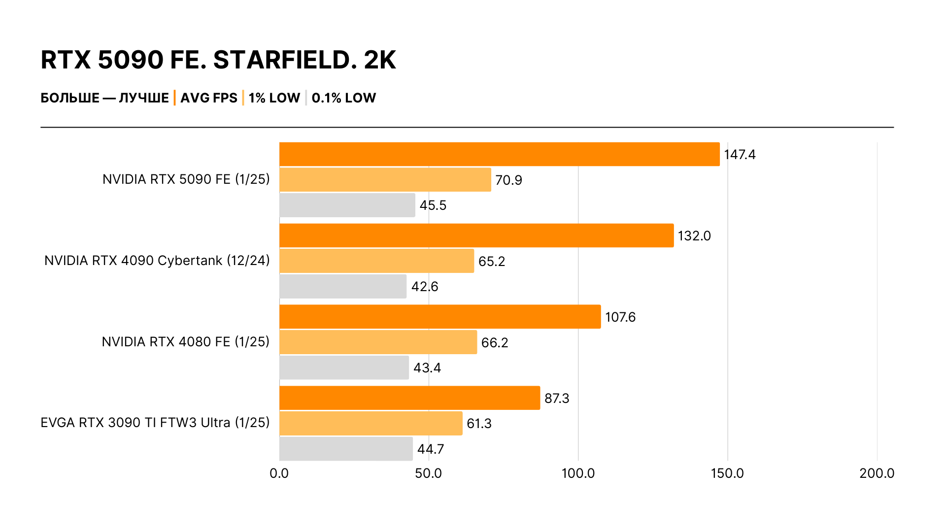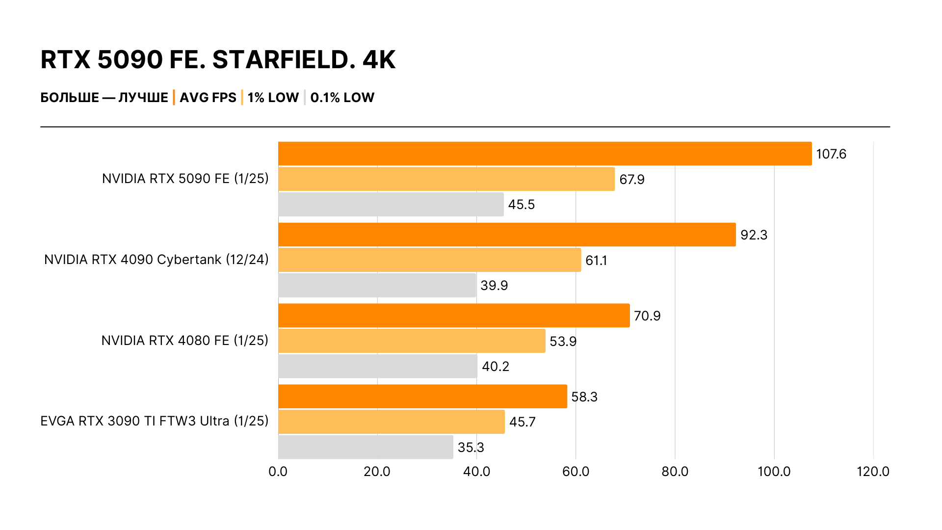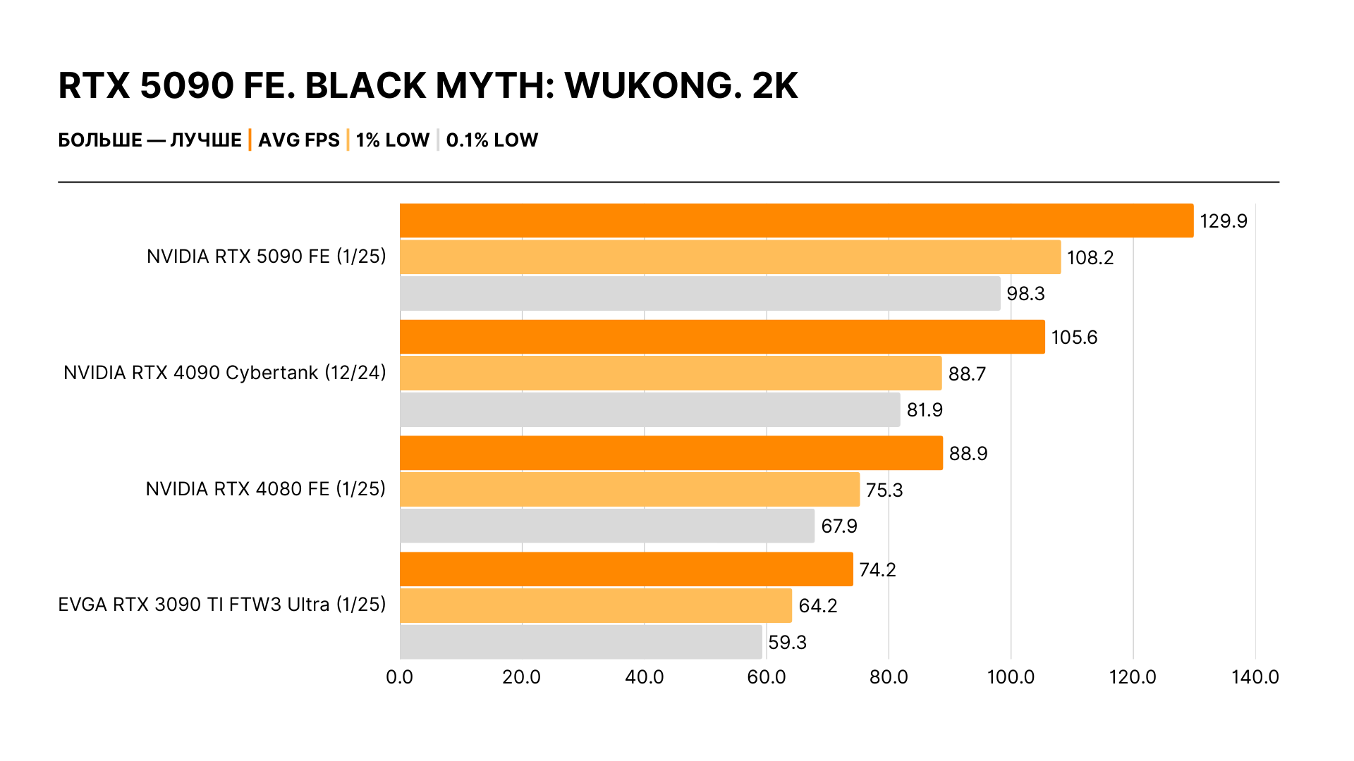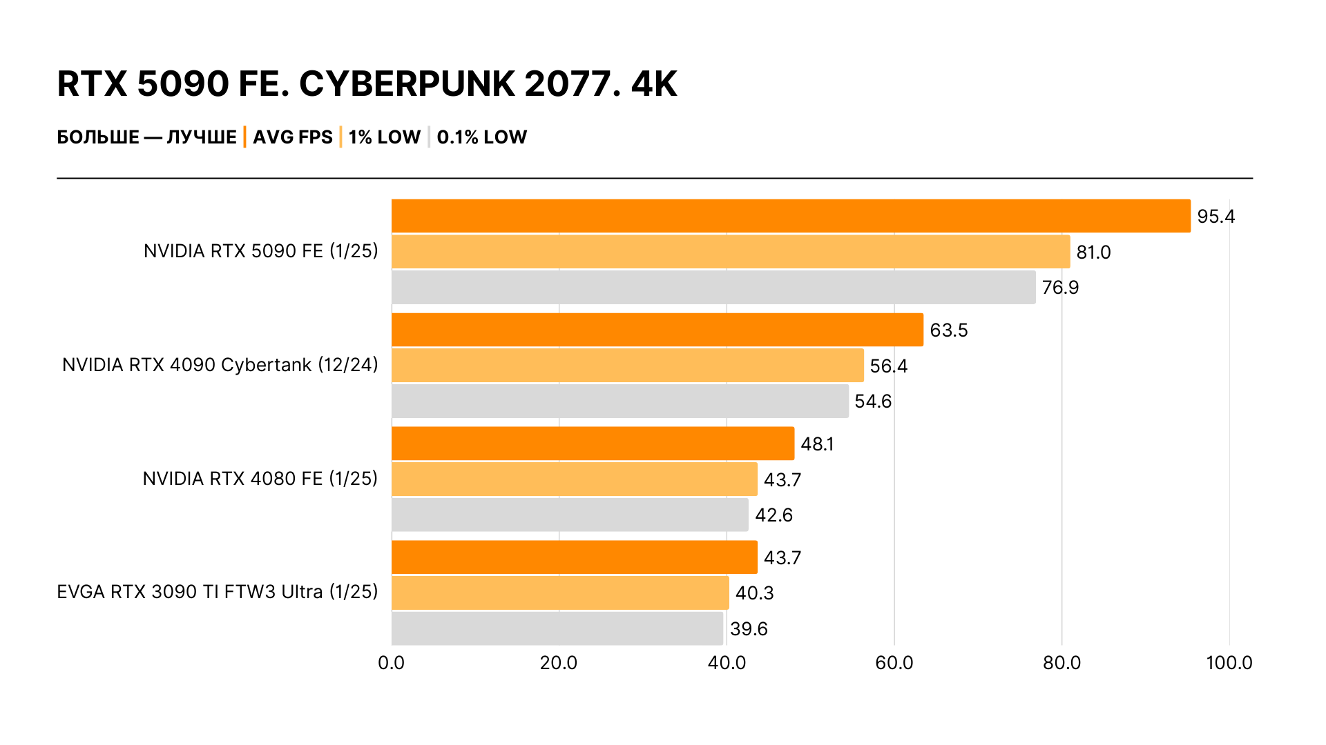 Увлеченные энтузиасты и скептики оказались правы: реальный прирост производительности не имеет ничего общего с обещаниями Дженсена Хуанга. Никакого двукратного отрыва нет: действительные цифры — в районе 30% в 4K относительно RTX 4090 и 20% в 2K в сравнении с ней же. Самый высокий зафиксированный результат — 40%, но это исключение из правил.