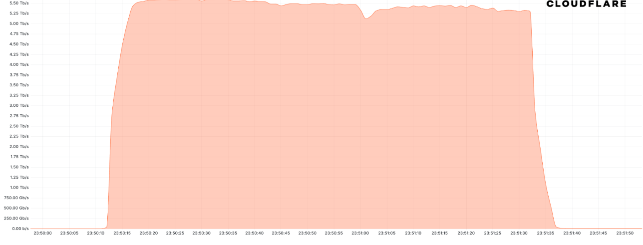 29 октября UDP-DDoS-атака со скоростью 5,6 Тбит/с, запущенная ботнетом Mirai, была нацелена на клиента Cloudflare Magic Transit, интернет-провайдера (ISP) из Восточной Азии. Атака длилась всего 80 секунд и была запущена с более чем 13000 IoT-устройств.