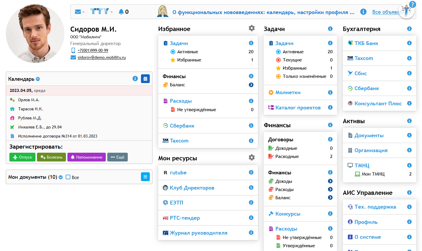 В блоке экономики и финансов системы формируется бюджет по различным статьям, мероприятиям и подразделениям. Обеспечивается управление договорами, их существенными условиями, календарными планами и процессом согласования, поддерживаются электронные архивы документаций.