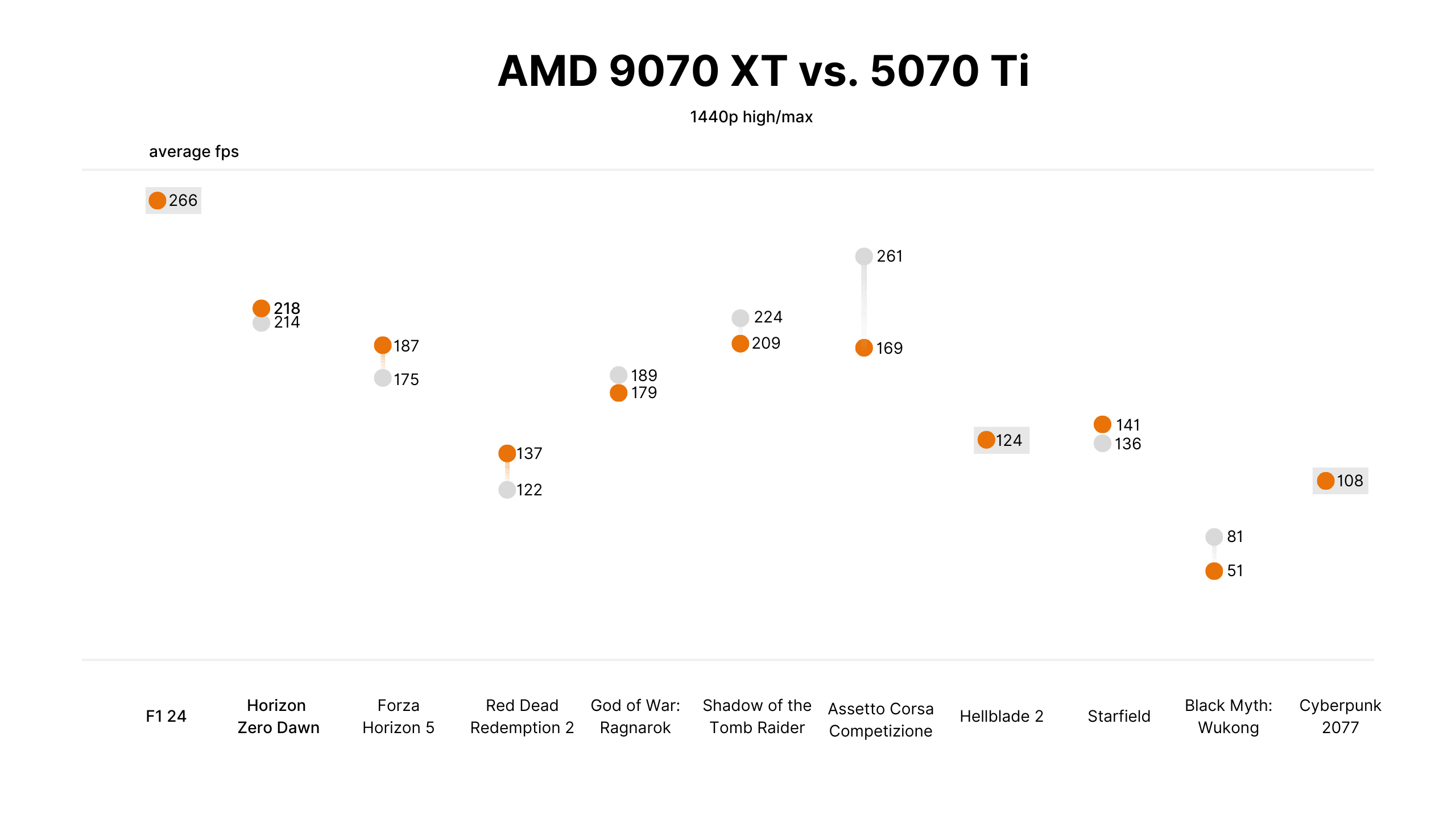 Что касается RX 9700 XT, которая стоит всего на $50 больше, то она практически равна RTX 5070 Ti и в среднем отстает всего на 5%, если не считать аномалий вроде все тех же Assetto Corsa и Black Myth: Wukong, где последняя быстрее на 54% и 58% соответственно. Главный вопрос здесь в том, можно ли это простить, если взять в расчет разницу в ценниках: RTX 5070 Ti дороже на $150.