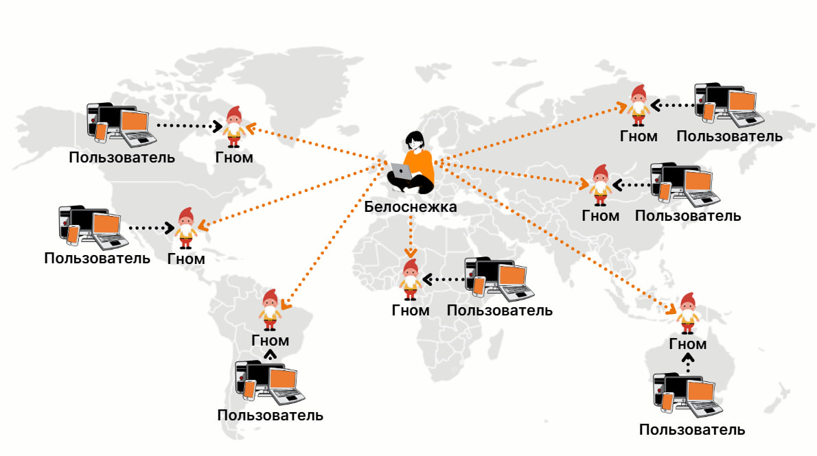 Поскольку ранее речь шла о гномах, пример будет по аналогии с ними. Дополнительно в рассказ будет добавлена Белоснежка. Она любой сайт с контентом, а резвые карлики в колпачках — серверы Content Delivery Network (CDN).