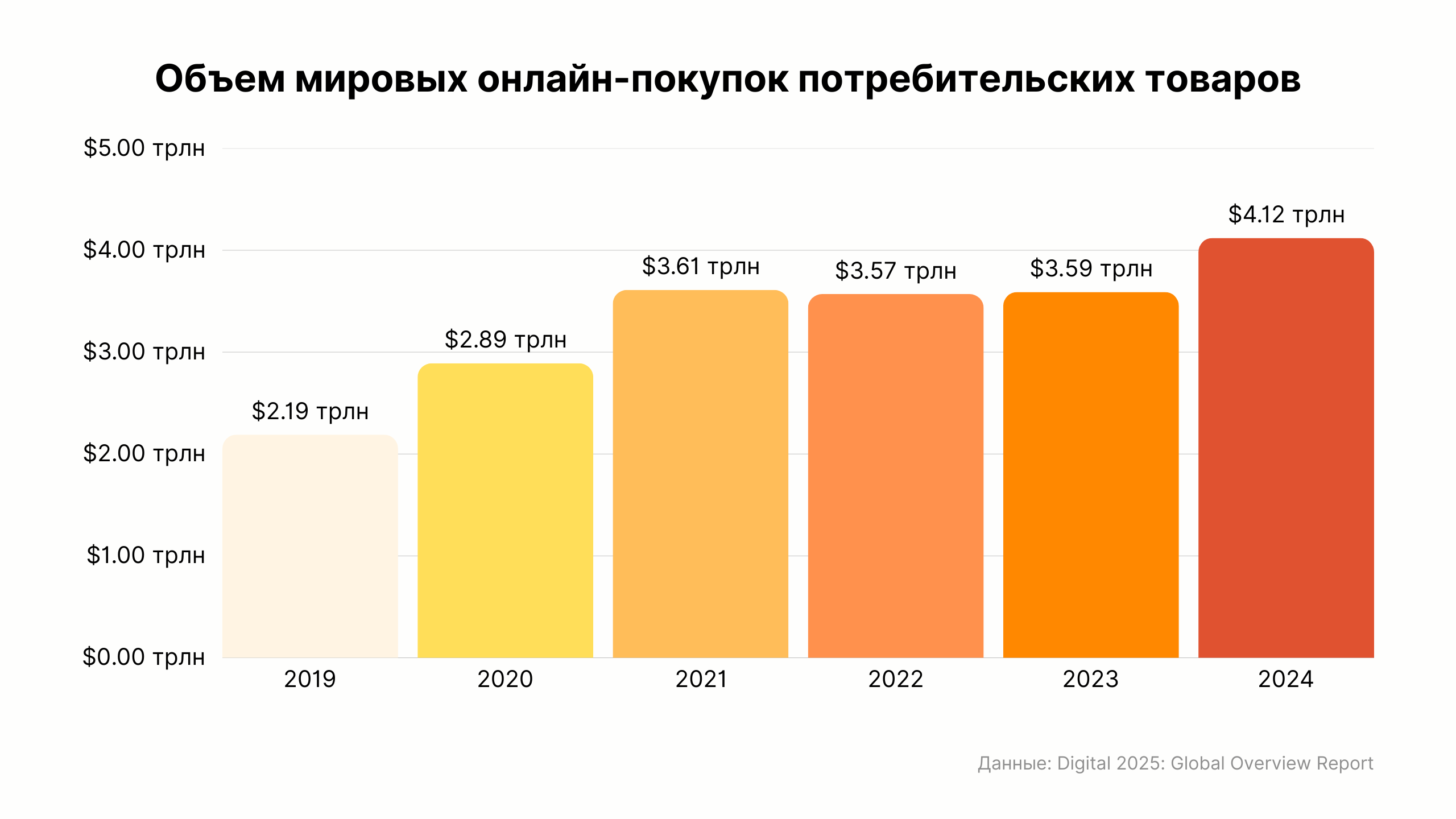В 2024 году объем мировых онлайн-покупок потребительских товаров превысил 4,12 трлн долларов США. Это на полтриллиона долларов больше, чем в 2023 году, что соответствует росту на 14,6% в годовом исчислении.