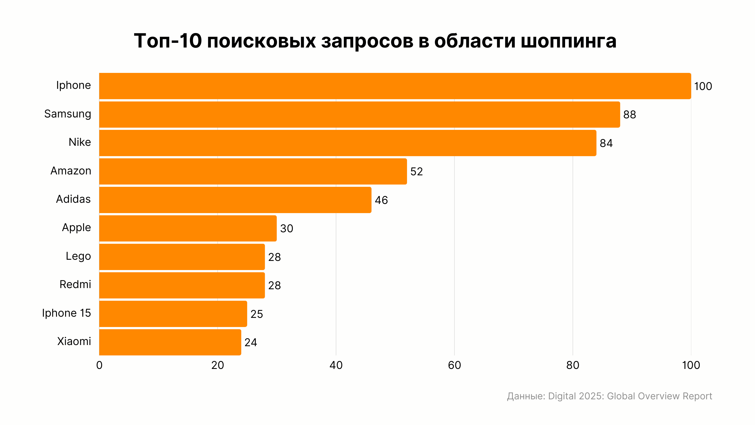 Как сообщают авторы отчета со ссылкой на Google Trends, в 2024 году iPhone был самым популярным товаром в мире. Объем его поисковых запросов на 12% превысил показатели Samsung. Интересно отметить, что iPhone опередил свой «главный» бренд Apple: поиск по смартфонам компании происходит в три раза чаще, чем поиск по бренду компании.