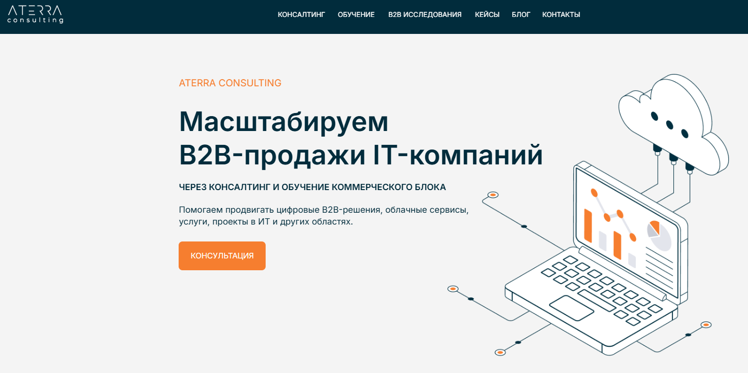 ATERRA Consulting позиционирует себя как агентство по развитию B2B-продаж ИТ-решений. Специализация — помощь ИТ-компаниям (включая SaaS-провайдеров, разработчиков софта, системных интеграторов) продавать больше сложных цифровых продуктов.