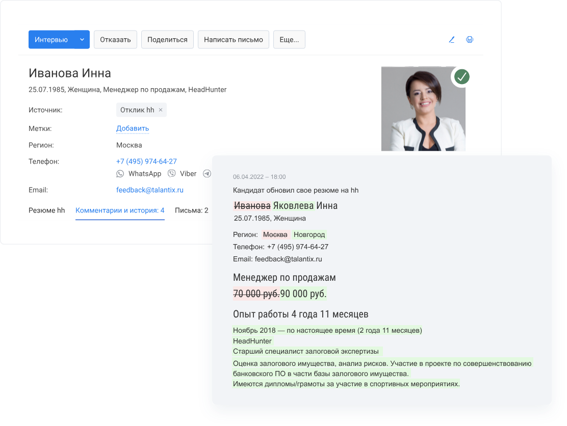 Talantix также способствует накоплению кадрового резерва. С помощью функции автообновления резюме кандидатов с откликов на hh.ru, если претендент уже есть в вашей базе и обновляет свое резюме на платформе, то информация в базе автоматически актуализируется. Это означает, что рекрутеры всегда имеют доступ к самым свежим данным о кандидатах, что позволяет им рассматривать этих специалистов на будущие вакансии с учетом их актуального опыта и навыков.