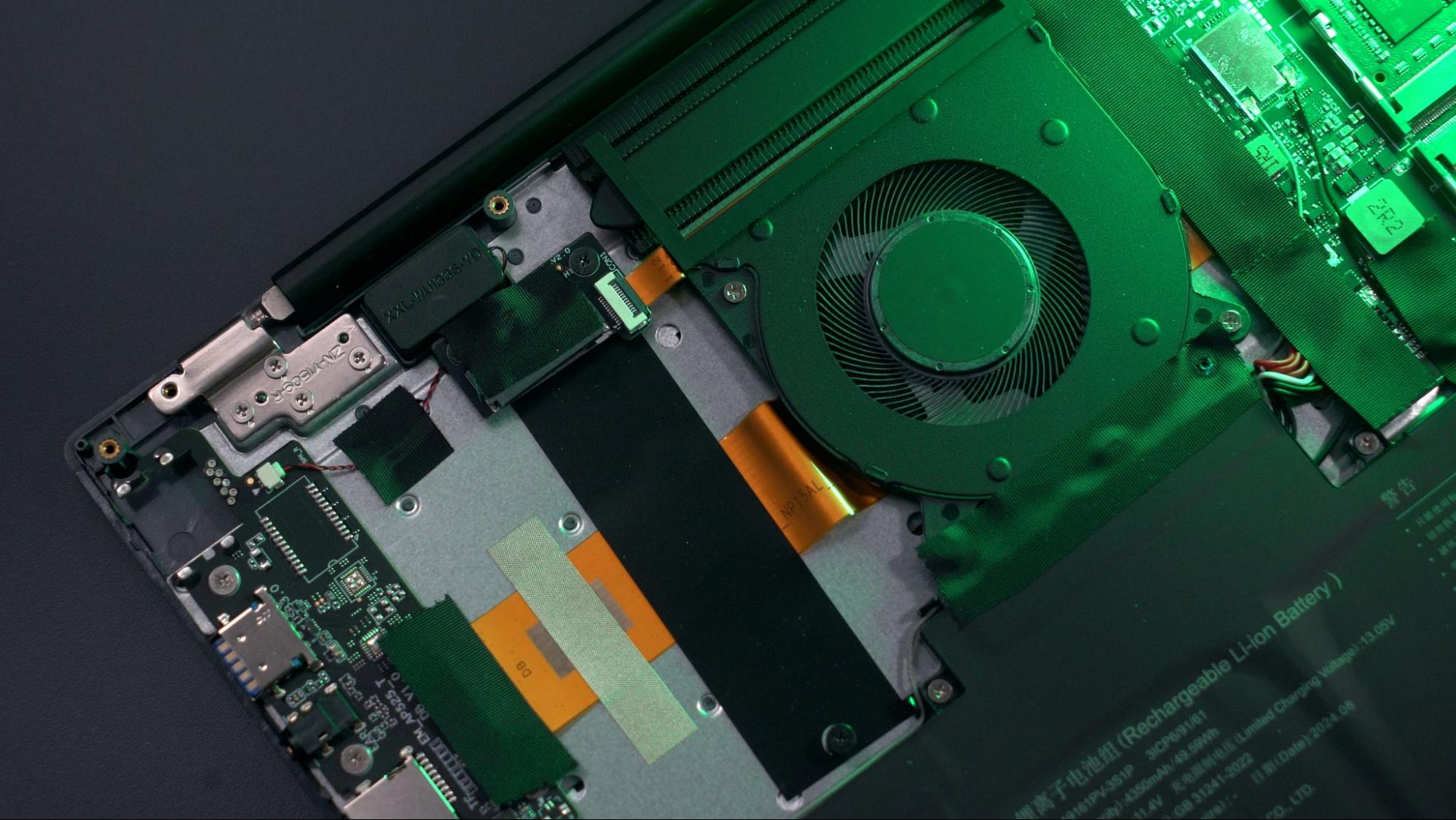 Система охлаждения минималистичная: по одной турбине, тепловой трубке и радиатору плюс медный теплосъемник, отводящий жар от CPU со встроенной графикой.