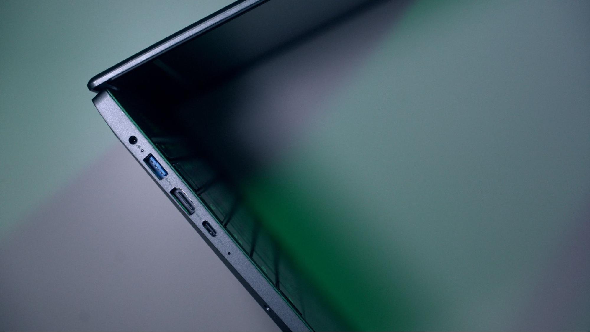 Теперь — о портах. Их не очень много, но все необходимые на месте. Слева — гнездо питания, USB Type-A 3.2, полноразмерный HDMI и USB Type-C 3.2.
