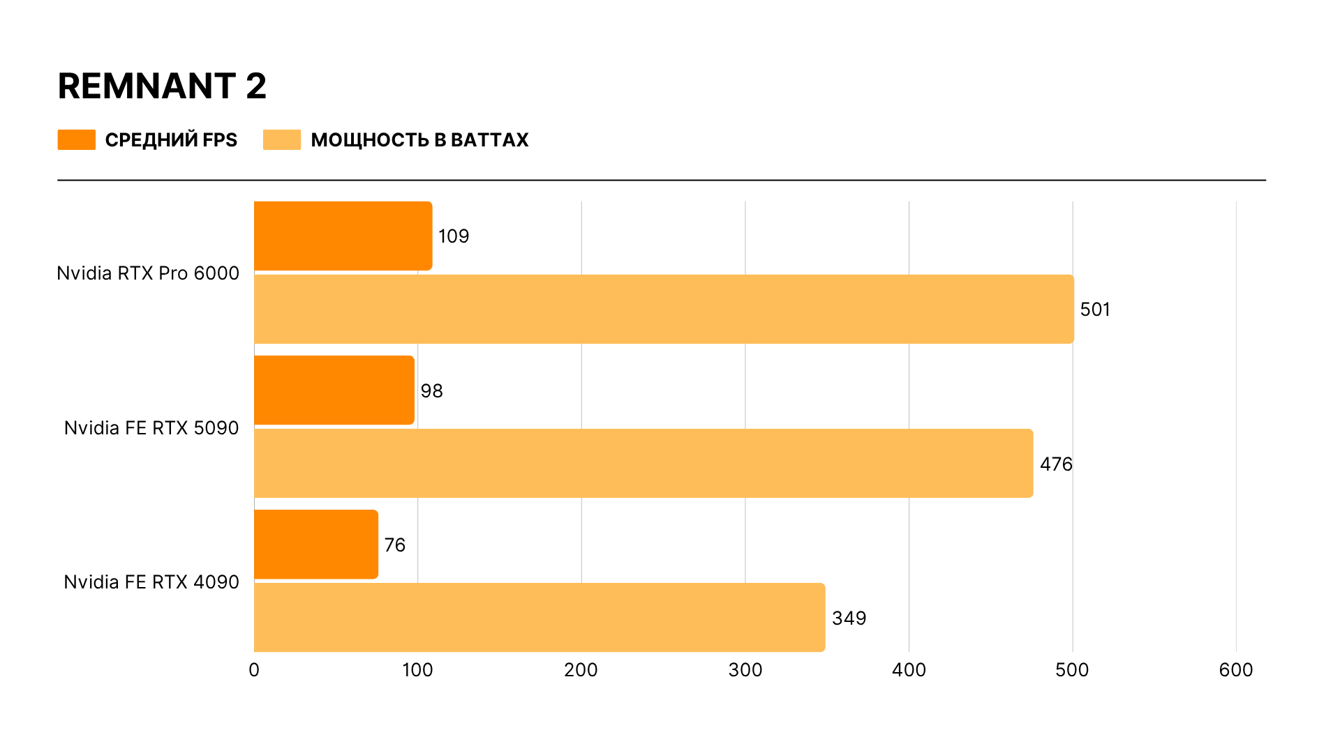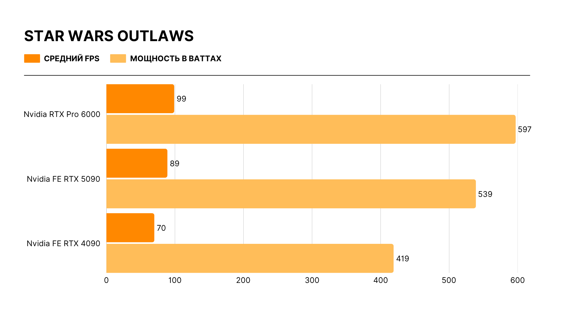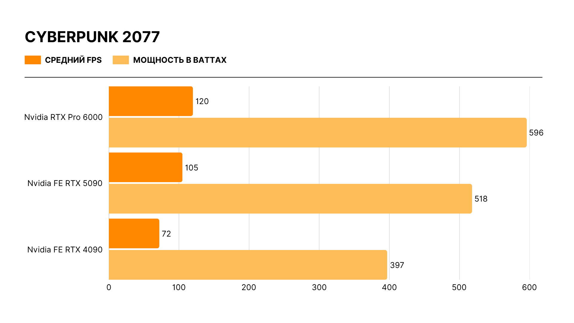 По результатам тестирования в трех популярных тайтлах: Cyberpunk 2077, Star Wars: Outlaws и Remnant 2, профессиональная карта быстрее, чем RTX 4090 и RTX 5090, в среднем на 50% и 12% соответственно.
