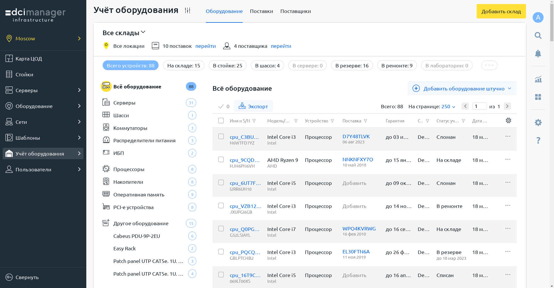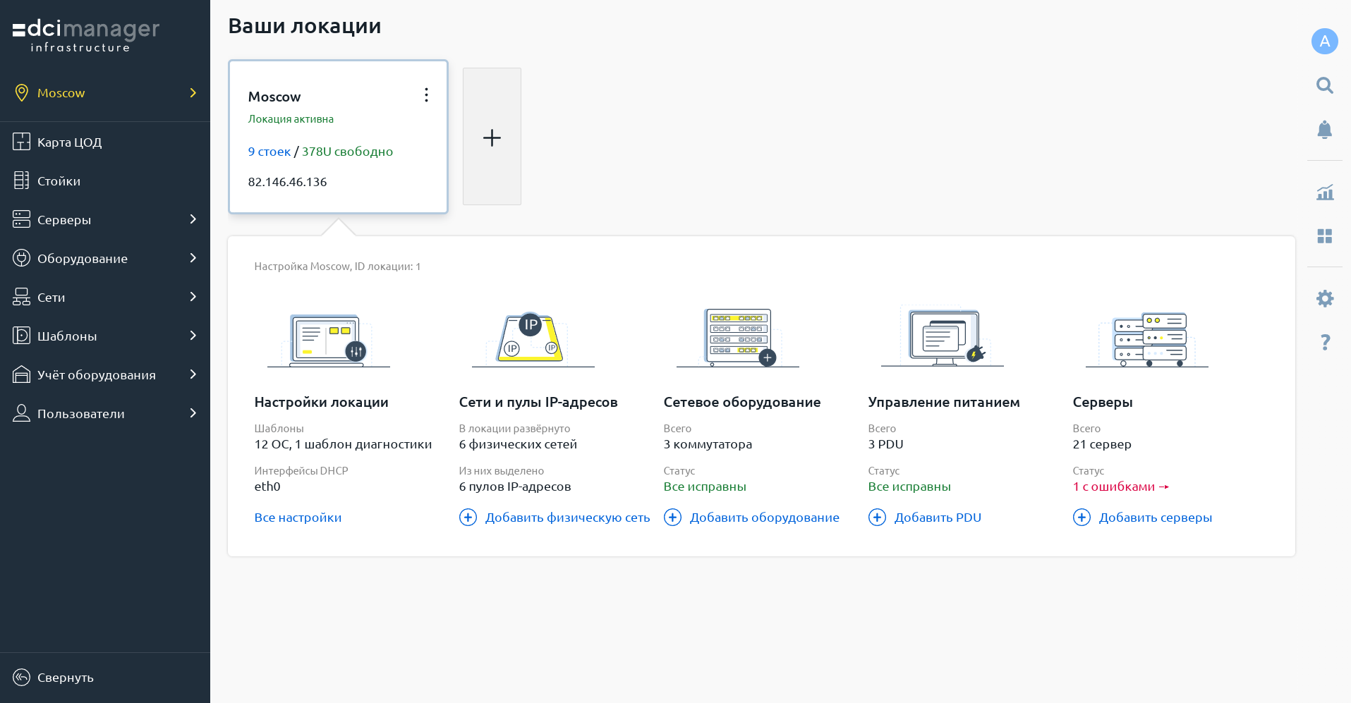 Платформа объединяет все ресурсы дата-центра — серверы, сетевые устройства и вспомогательное оборудование — в единую панель управления. DCImanager 6 поддерживает работу с несколькими географически распределенными площадками, позволяя централизованно управлять инфраструктурой независимо от ее расположения.