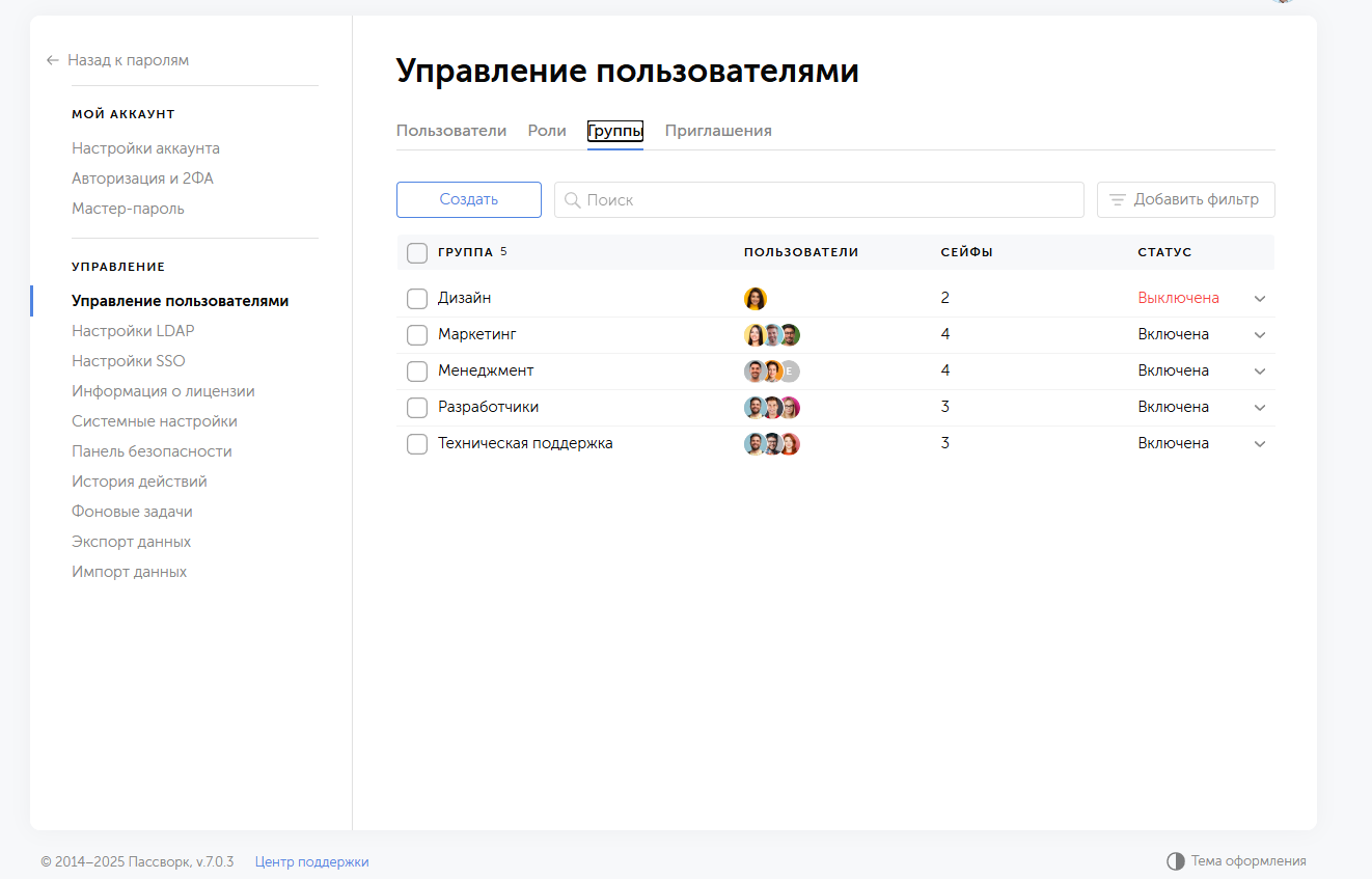 То, что в предыдущих версиях называлось «Ролями», теперь переименовано в «Группы». Они используются для объединения пользователей и настройки доступа к сейфам — по логике, схожей с Active Directory. Такой подход дает больше гибкости в управлении командами и сокращает рутину при подключении новых сотрудников.