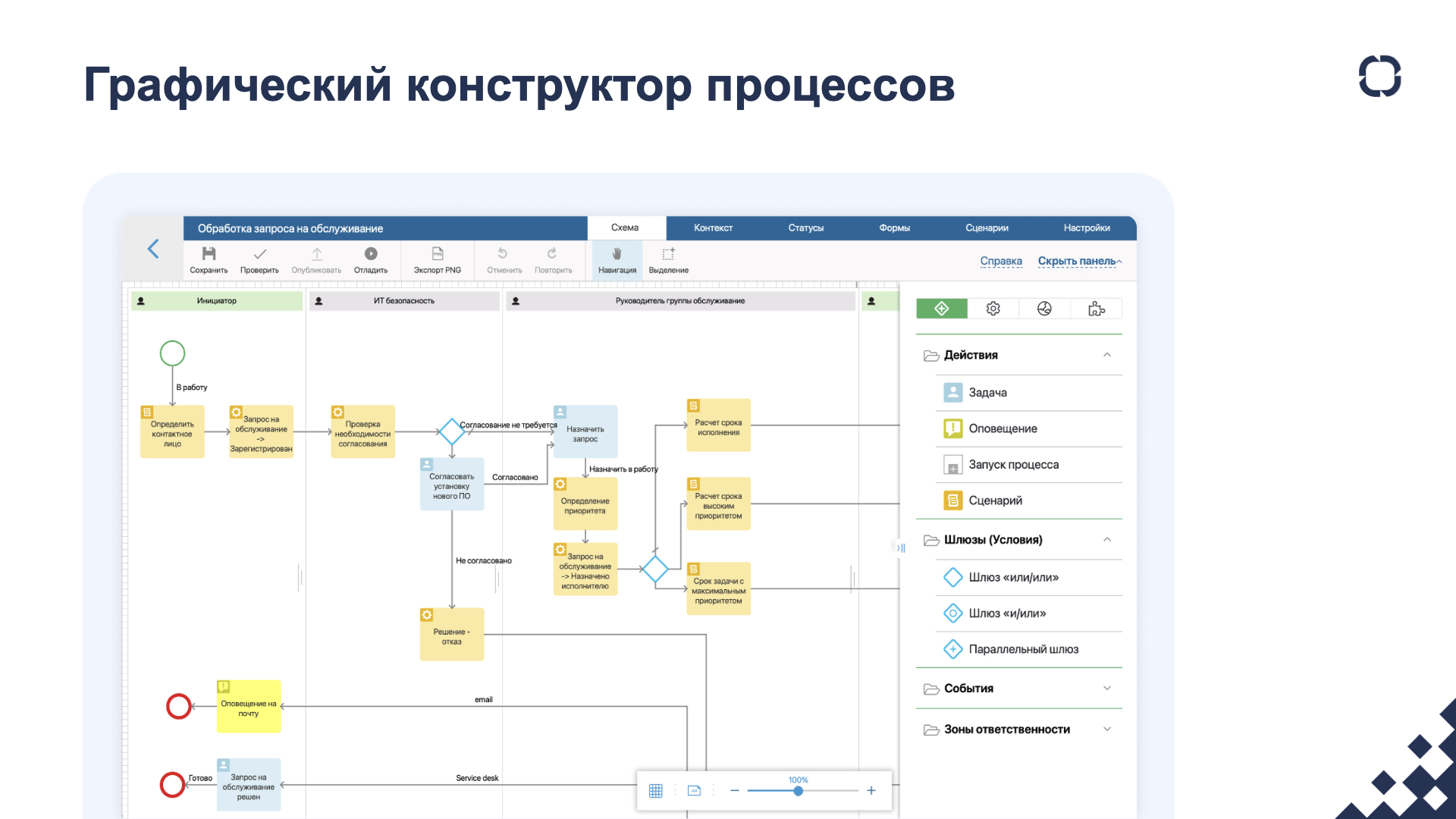 Визуальный процессный движок ELMA365 позволяет моделировать любые бизнес-сценарии с нуля — от простых согласований до сквозных кросс-функциональных процессов. Пользователи настраивают маршруты, роли, бизнес-логику, SLA и точки интеграции в визуальном редакторе без программирования. Все изменения вносятся быстро и без остановки системы.