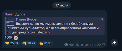 Сам Павел Дуров — создатель Telegram, ответил сообщением «100%» на свой предыдущий пост, в котором он заявил: «Возможно, что мы имеем дело не с безобидными ошибками журналистов, а с целенаправленной кампанией по дискредитации Telegram».