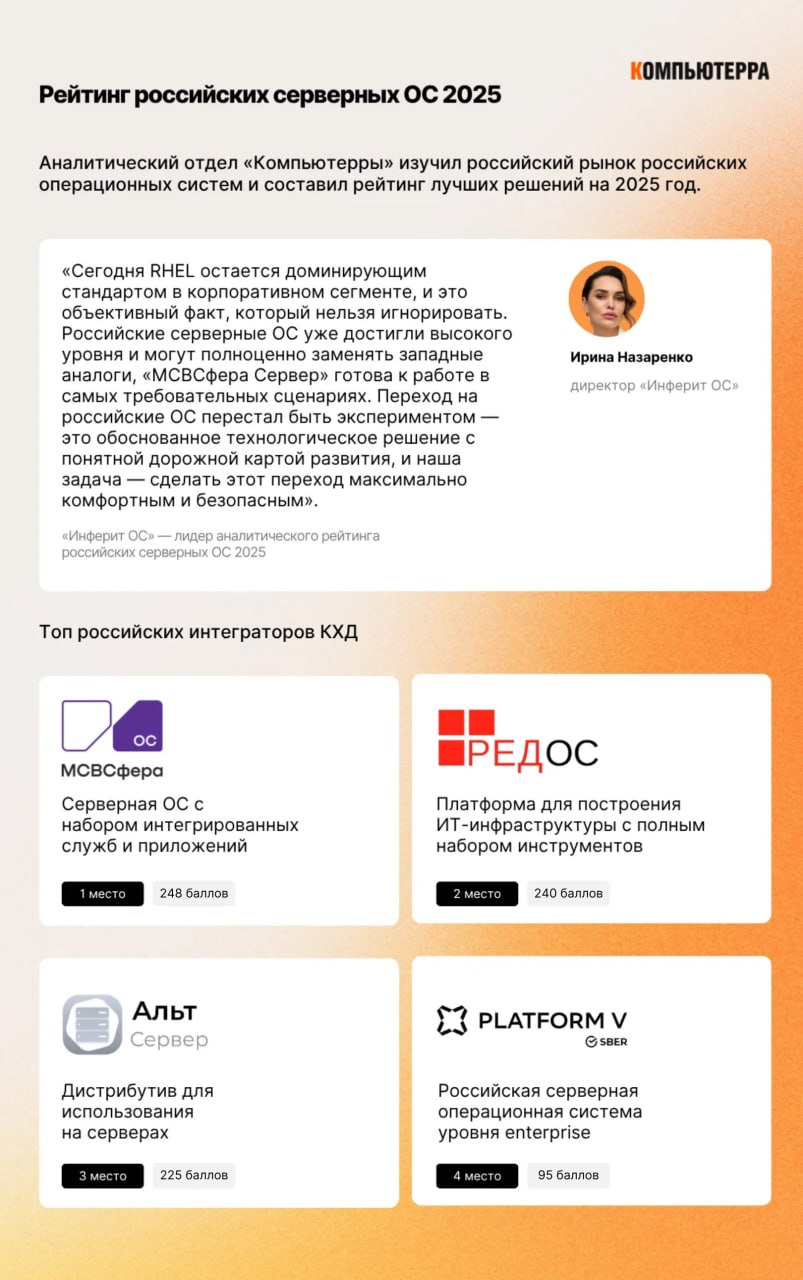 Лидером рейтинга российских серверных операционных систем стала «МСВСфера Сервер» 9 от компании «Инферит» (ГК Софтлайн), набрав 248 баллов.