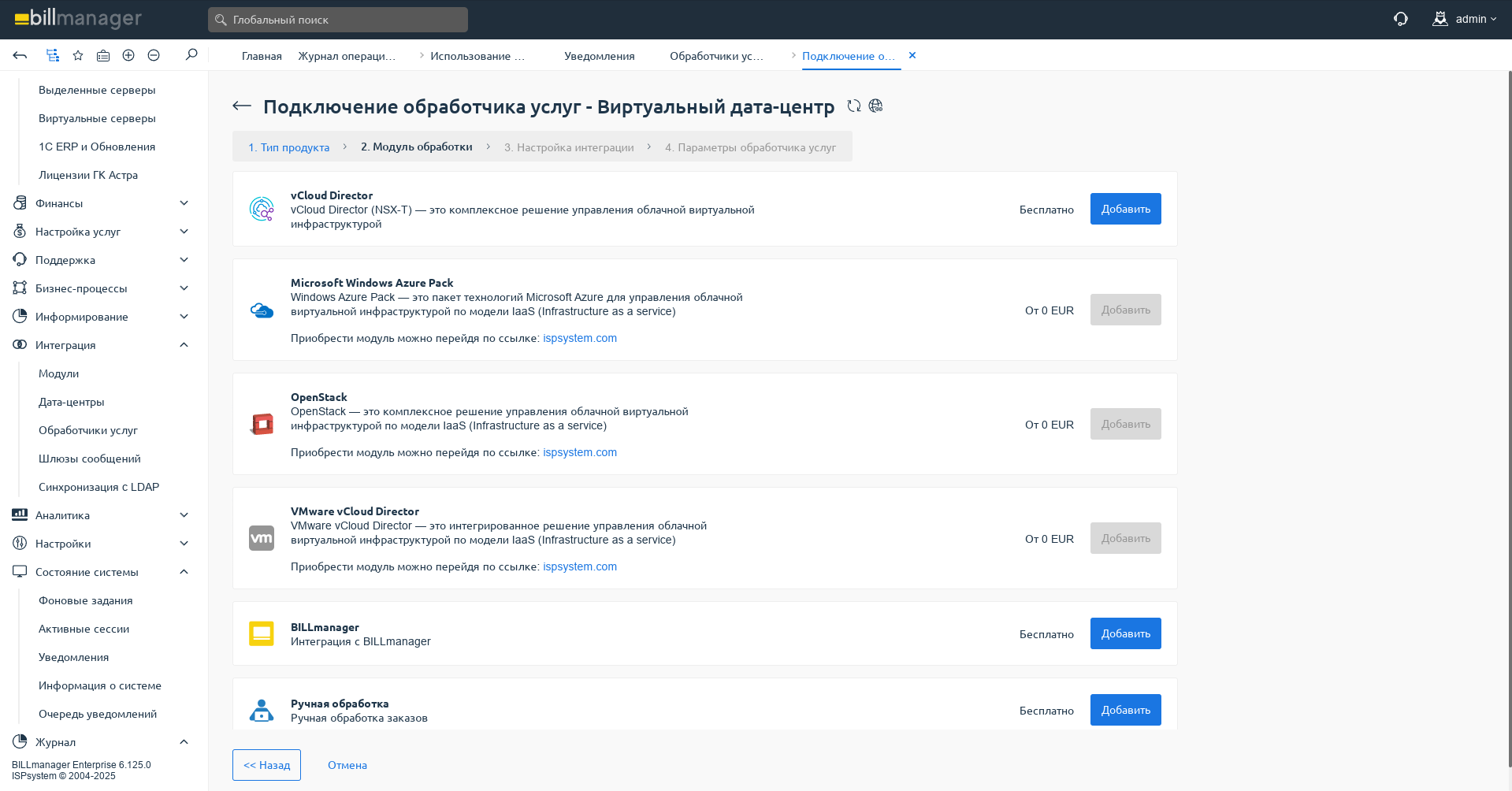 BILLmanager 6 поддерживает интеграцию с ведущими решениями для виртуализации и управления облачными ресурсами. Связка с OpenStack позволяет централизованно управлять виртуальными машинами и дата-центрами, автоматизируя выдачу ресурсов. Интеграция с VMware vCenter упрощает работу с виртуальными машинами, а с Cloud Director — управление виртуальными дата-центрами и виртуальными машинами на базе VMware.