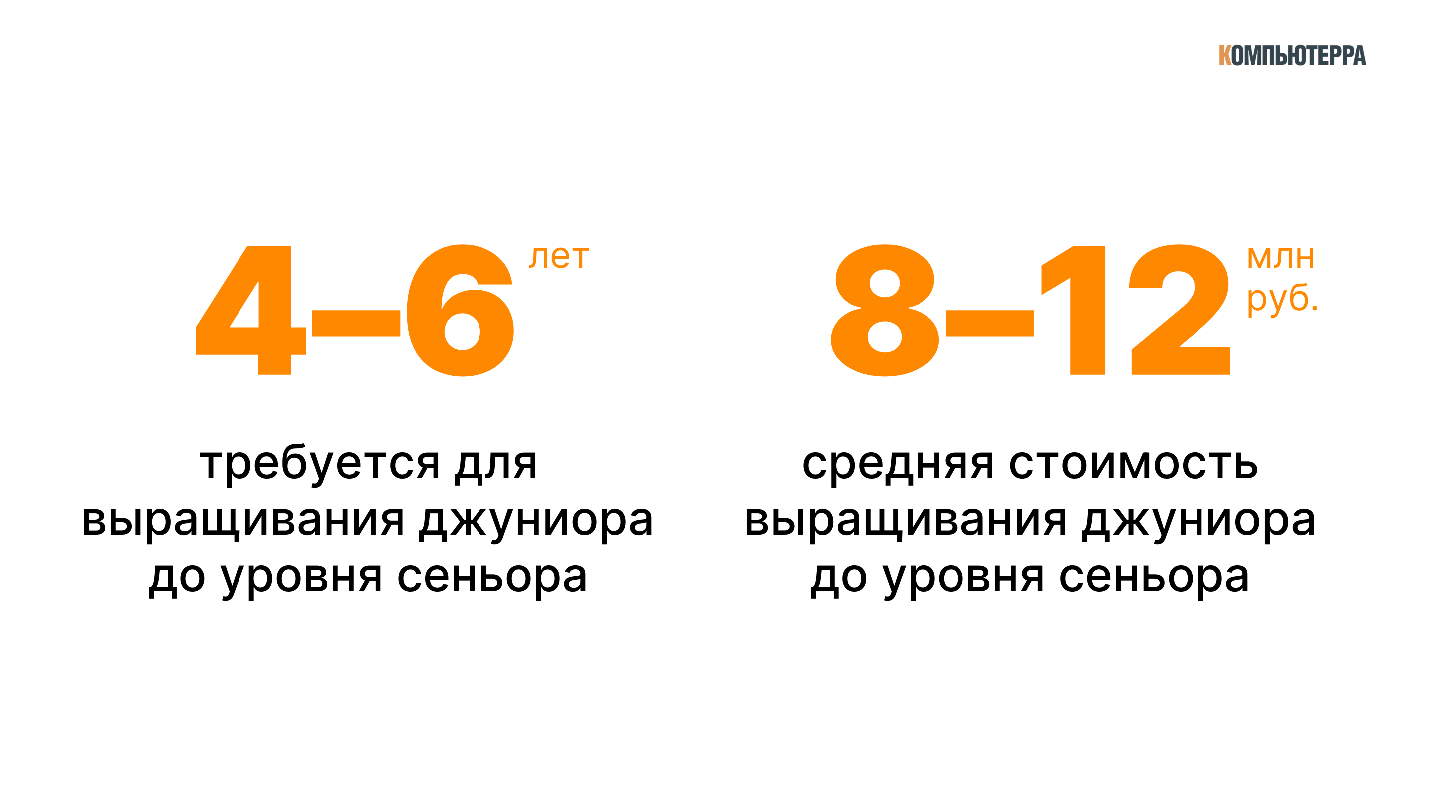 Время — главный фактор в уравнении затрат. CEO компании «Облакотека» Максим Захаренко отмечает, что вырастить джуниора до уровня сеньора занимает в среднем 4–6 лет работы, при условии, что в компании есть менторство, выстроен карьерный план и постоянно в наличии сложные задачи.