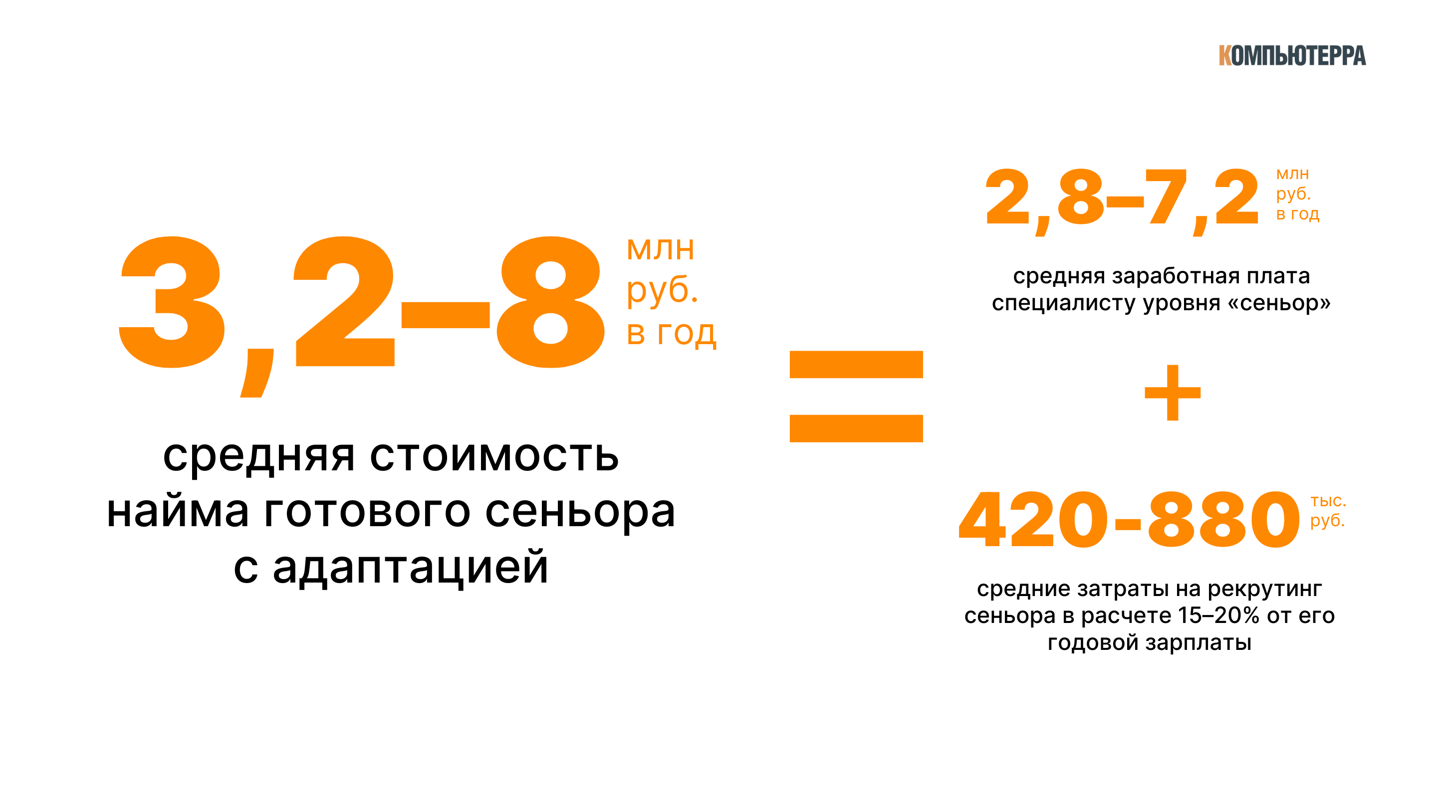 «Найм уже готового сеньора по первым годам кажется выгоднее: зарплата около 2,9 млн рублей плюс рекрутинговый гонорар — еще около 500 тыс. рублей. За два года такой подход почти вдвое дешевле и незаменим, когда продукт нужно вывести в сжатые сроки», — рассуждает Фроликов.
