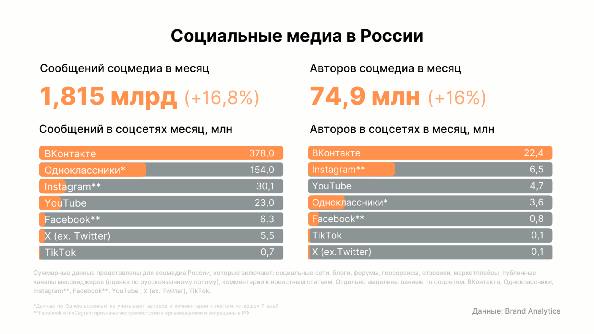 Среди соцсетей — это в первую очередь «ВКонтакте». Ежемесячно платформу посещают больше 93 млн человек (76% населения), за день — около 59 млн. По данным Brand Analytics, на площадке около 74,9 млн авторов в месяц.