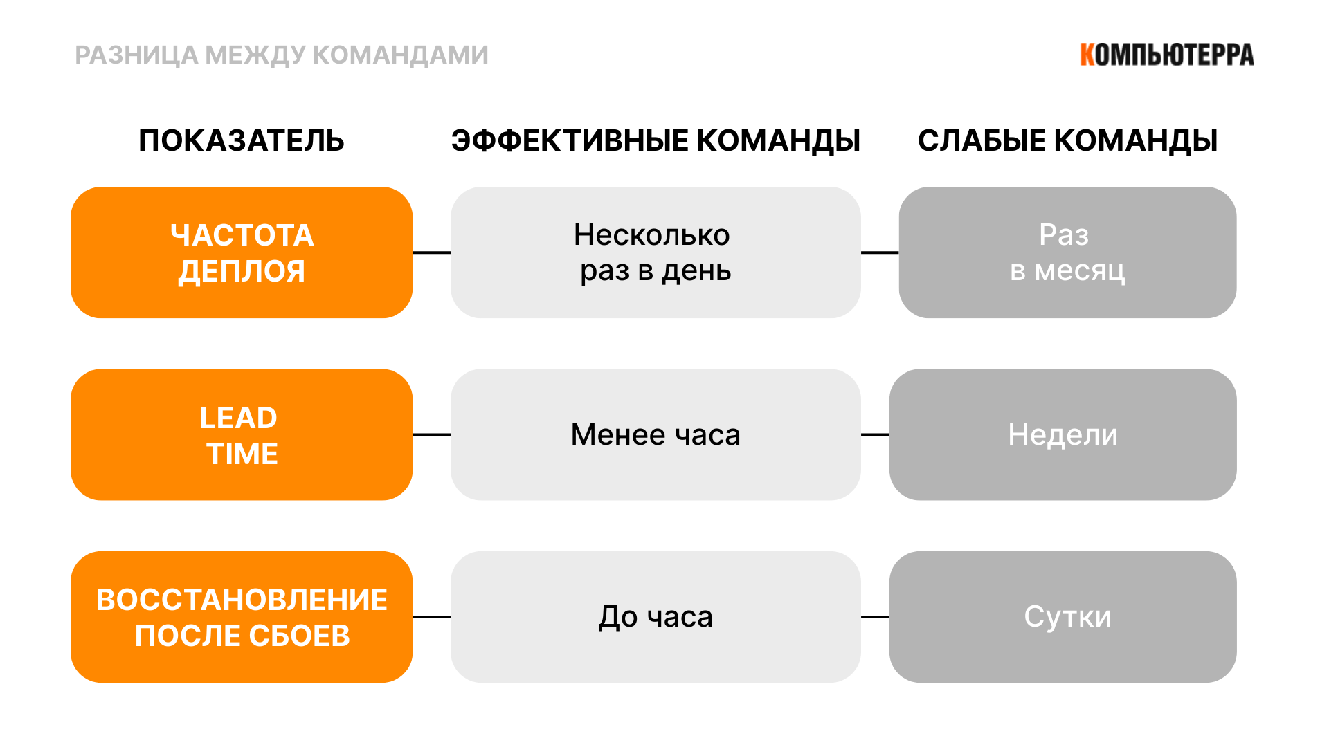 По данным исследований DORA, которые приводит Елена Назарова, разница между высокоэффективными и слабыми командами кардинальна: