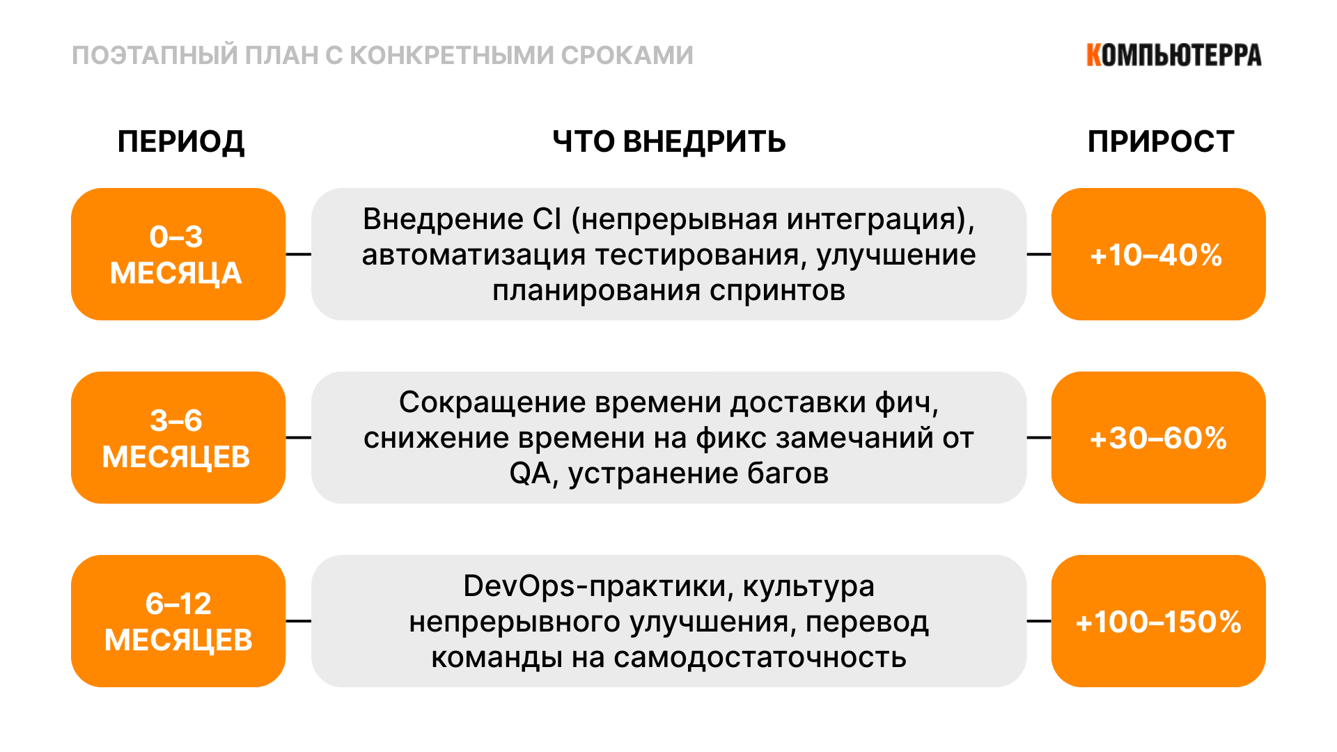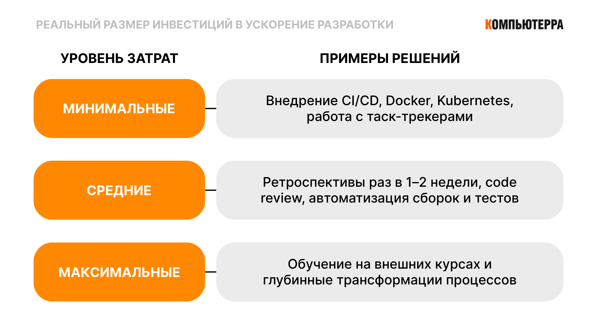 - оптимизация процессов — самое низкое по затратам улучшение, делается внутри команды через ретроспективы и занимает около 2-3 месяцев.