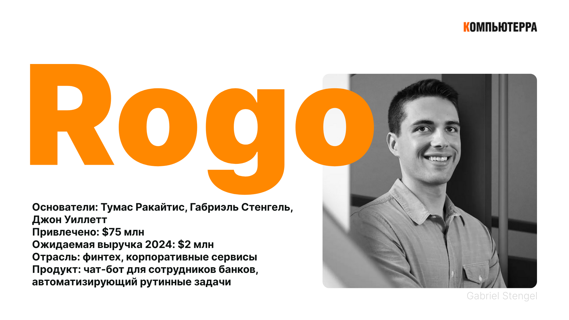 Rogo — проект Тумаса Ракайтиса, Габриэля Стенгеля и Джона Уиллетта. Компания привлекла $75 млн от AlleyCorp, Khosla Ventures и Thrive Capital, делая чат-боты для банковских сотрудников.