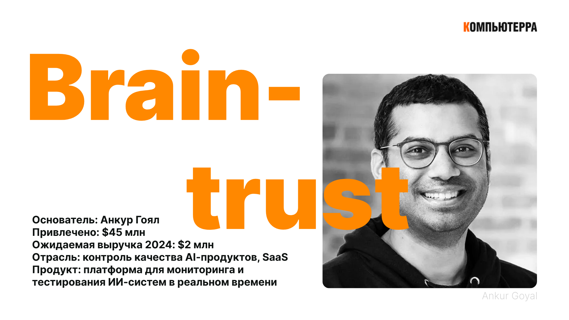 Анкур Гоял запустил Braintrust как сервис контроля качества ИИ-систем. В 2024 году компания закрыла раунд Series A на $36 млн под управлением Andreessen Horowitz, в котором участвовали Datadog и Databricks Ventures.