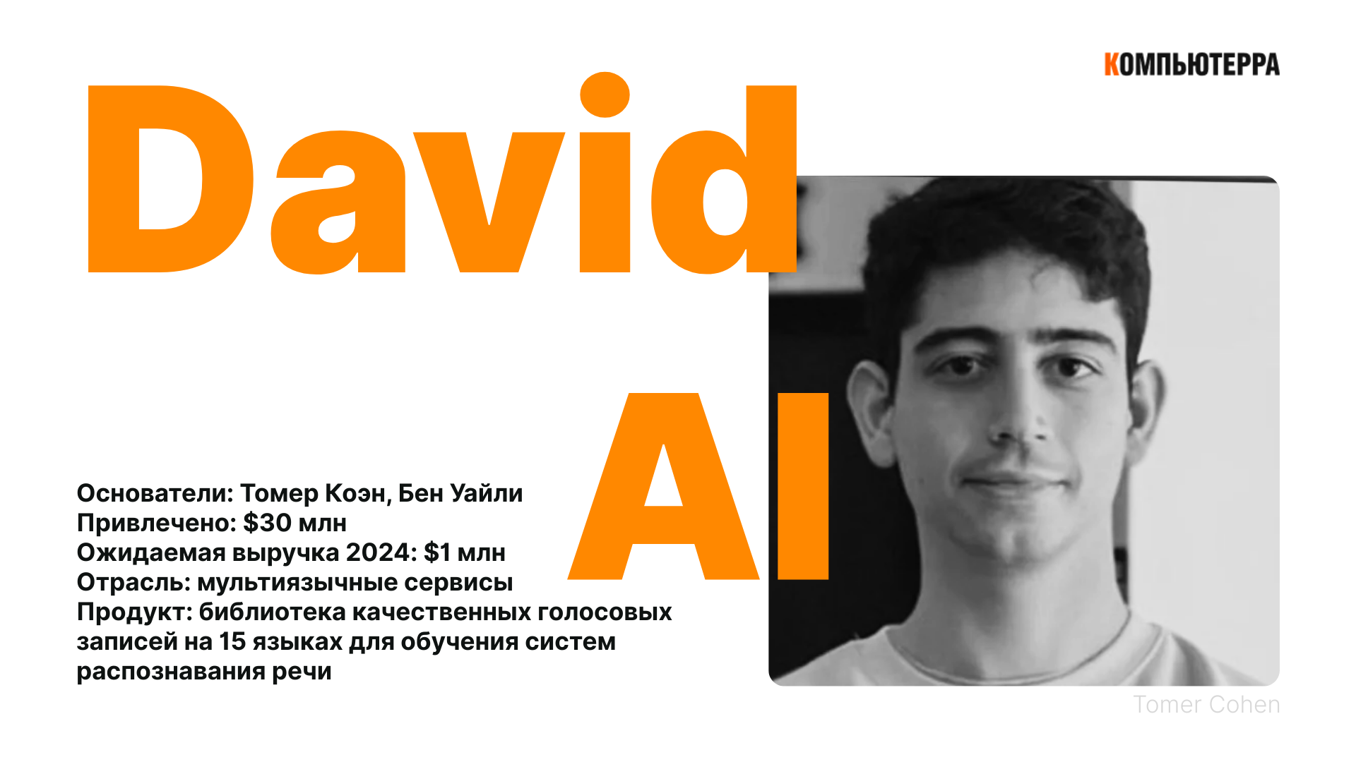 David AI основан Томером Коэном и Беном Уайли. Стартап работает в нише генерации голосовых данных и уже собрал $30 млн инвестиций от Alt Capital, Amplify Partners и First Round Capital. Основной продукт компании — библиотека записей на 15 языках, предназначенная для обучения систем распознавания речи.