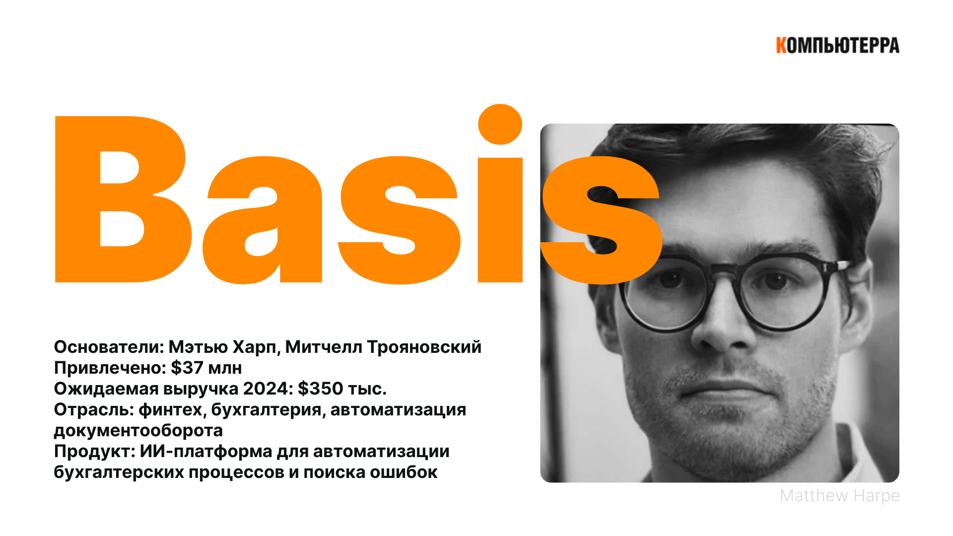 Basis создан в Нью-Йорке Мэтью Харпом и Митчеллом Трояновским. Стартап развивает платформу для автоматизации бухгалтерии и недавно привлек $34–37 млн в раунде, который возглавила Khosla Ventures.