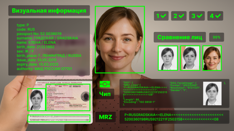 Технология последовательно считывает и сравнивает данные из четырех источников: визуальной зоны документа, машиносчитываемой области, NFC-чипа и селфи пользователя, сделанного на камеру смартфона. Из чипа извлекаются данные, что позволяет проверить достоверность информации и исключить подмену. Все элементы паспорта проверяются на согласованность: данные из разных источников сверяются между собой, включая сравнение изображений лиц.