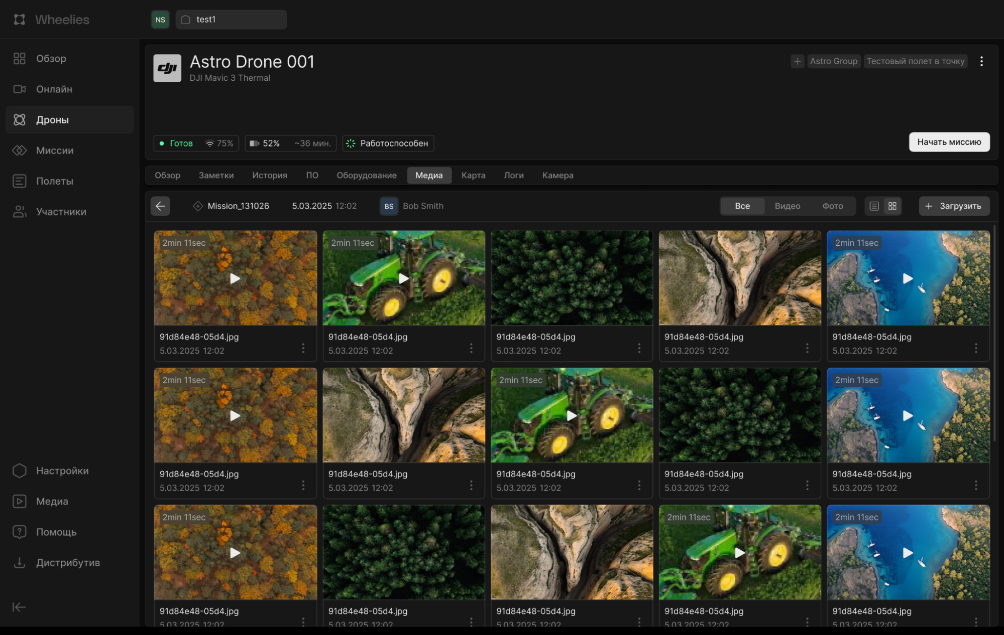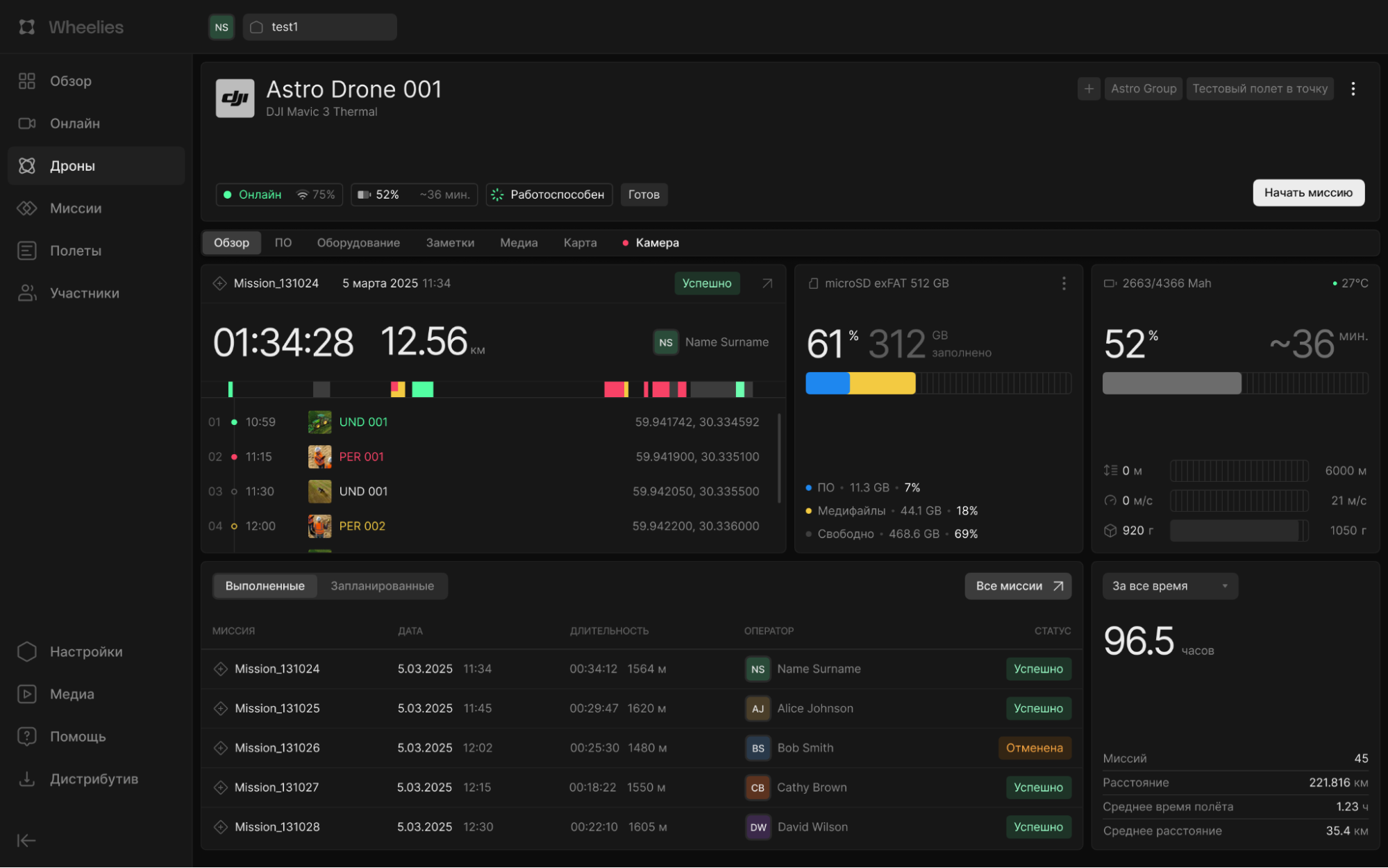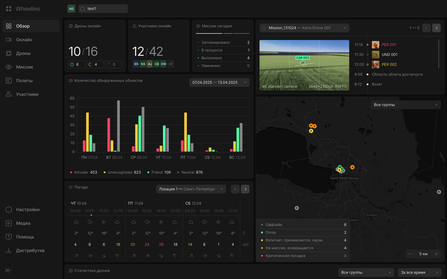 Wheelies обеспечивает полный контроль за выполнением миссий в режиме реального времени. Оператор видит местоположение каждого дрона на карте, получает телеметрию и видеопоток с бортовых камер. Это позволяет не только отслеживать ход операции, но и оперативно реагировать на изменения обстановки.