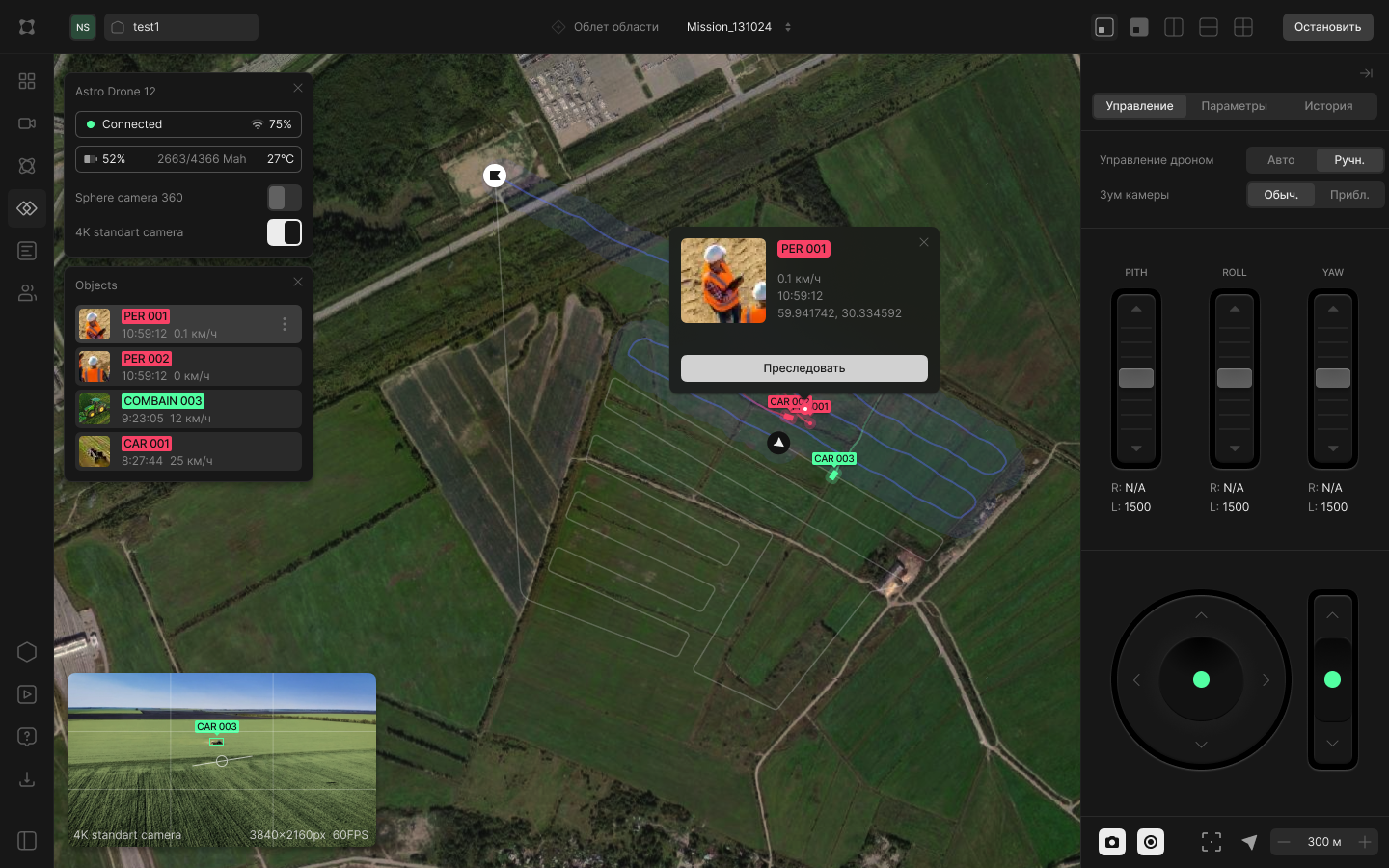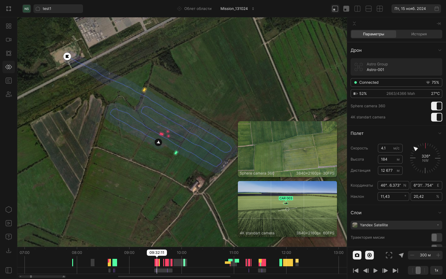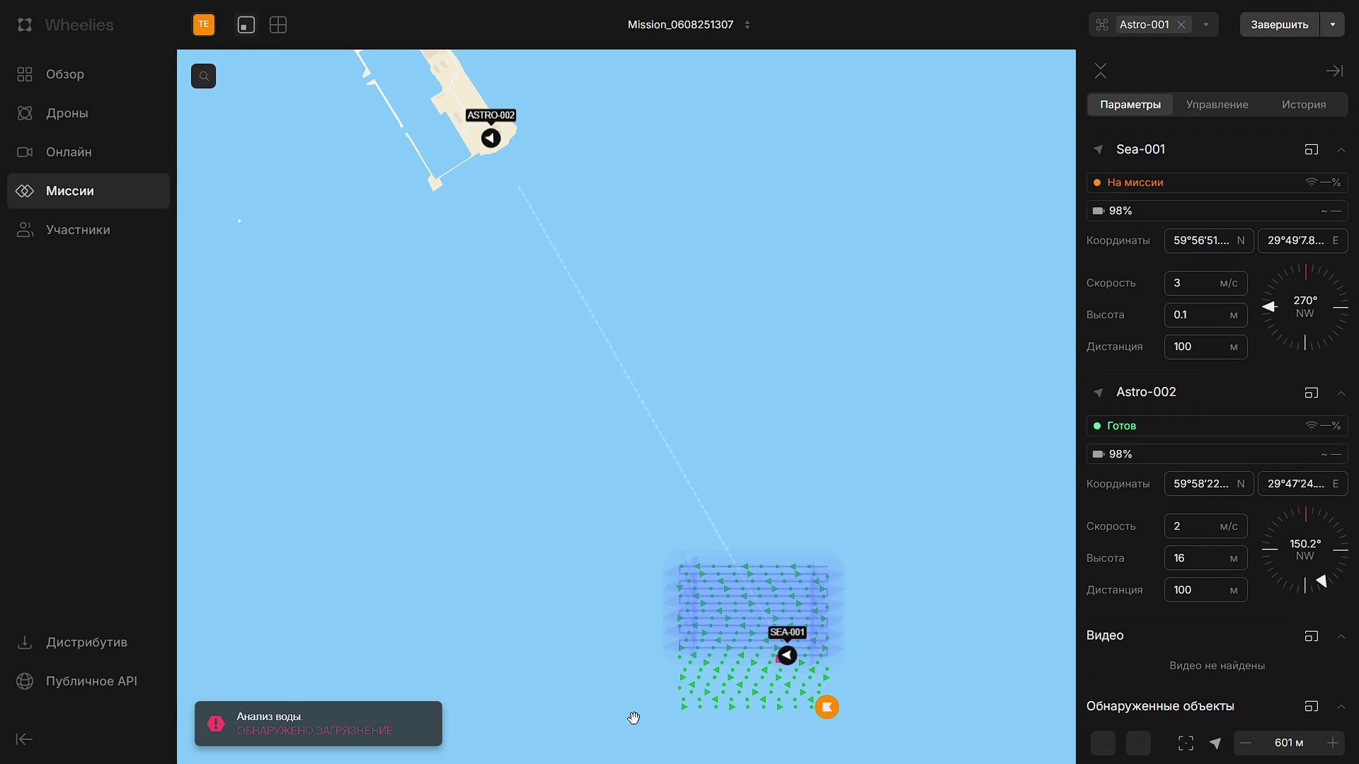 Wheelies обеспечивает полный контроль за выполнением миссий в режиме реального времени. Оператор видит местоположение каждого дрона на карте, получает телеметрию и видеопоток с бортовых камер. Это позволяет не только отслеживать ход операции, но и оперативно реагировать на изменения обстановки.