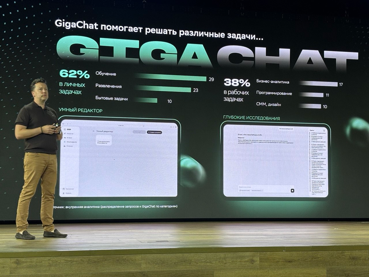 В «Сбере» уже развернули более 570 внутренних инициатив по автоматизации процессов и улучшению клиентского опыта. Суммарная аудитория GigaChat превысила 14 млн человек, ежедневная активность — более одного млн пользователей, а суточное количество запросов к ИИ превышает 800 млн.