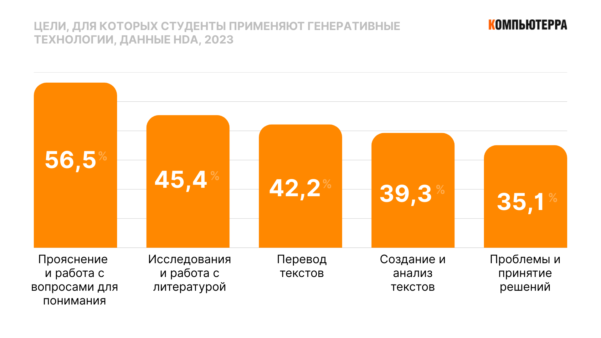 Популярнее всего — использование ИИ для объяснения сложных дисциплинарных концепций: 56% студентов обращаются к нему именно за этим. Далее идут задачи исследования и анализа литературы (45%), переводы (42%) и подготовка текстов (39%).
