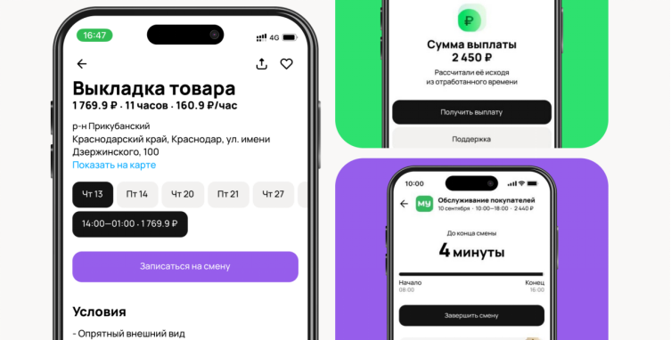 Начать подрабатывать можно в несколько кликов, а для старта исполнителю не нужно проходить собеседования. Ему достаточно иметь статус самозанятого (если его нет, на платформе помогут его оформить) и выбрать подходящую смену — все это можно сделать онлайн. Оплата за работу поступит в течение 1-2 суток после подтверждения завершения смены.
