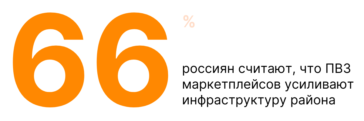 Более того, 66% россиян считают, что ПВЗ маркетплейсов усиливают инфраструктуру района. При этом: