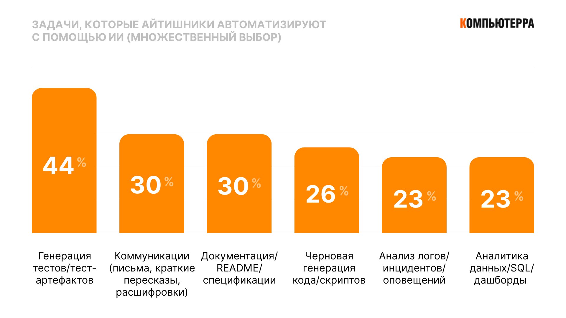 Согласно опросу сервиса «Анкетолог», проведенному в августе 2025 года, почти половина ИТ-специалистов (48%) регулярно используют ИИ в работе. Это не просто единичные запросы в ChatGPT или Copilot, а системная практика. Наибольшую популярность технологии набрали при генерации тестовых артефактов — к этому прибегают 44% респондентов. Еще 30% используют нейросети для написания документации, а 29% — для коммуникаций, например, подготовки писем или ответов клиентам.