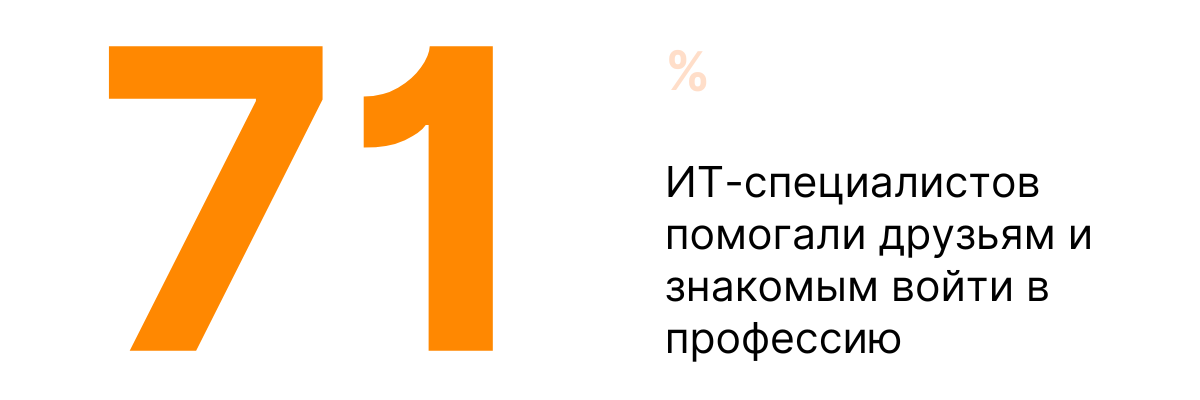 Любопытная деталь исследования касается взаимопомощи. 71% опрошенных помогали друзьям и знакомым войти в профессию. Чаще всего это советы по трудоустройству (38%), помощь в обучении (18%), рекомендации работодателям (14%) или поддержка при выполнении тестовых заданий и собеседованиях (14%). 7% и вовсе занимались полноценным менторством.