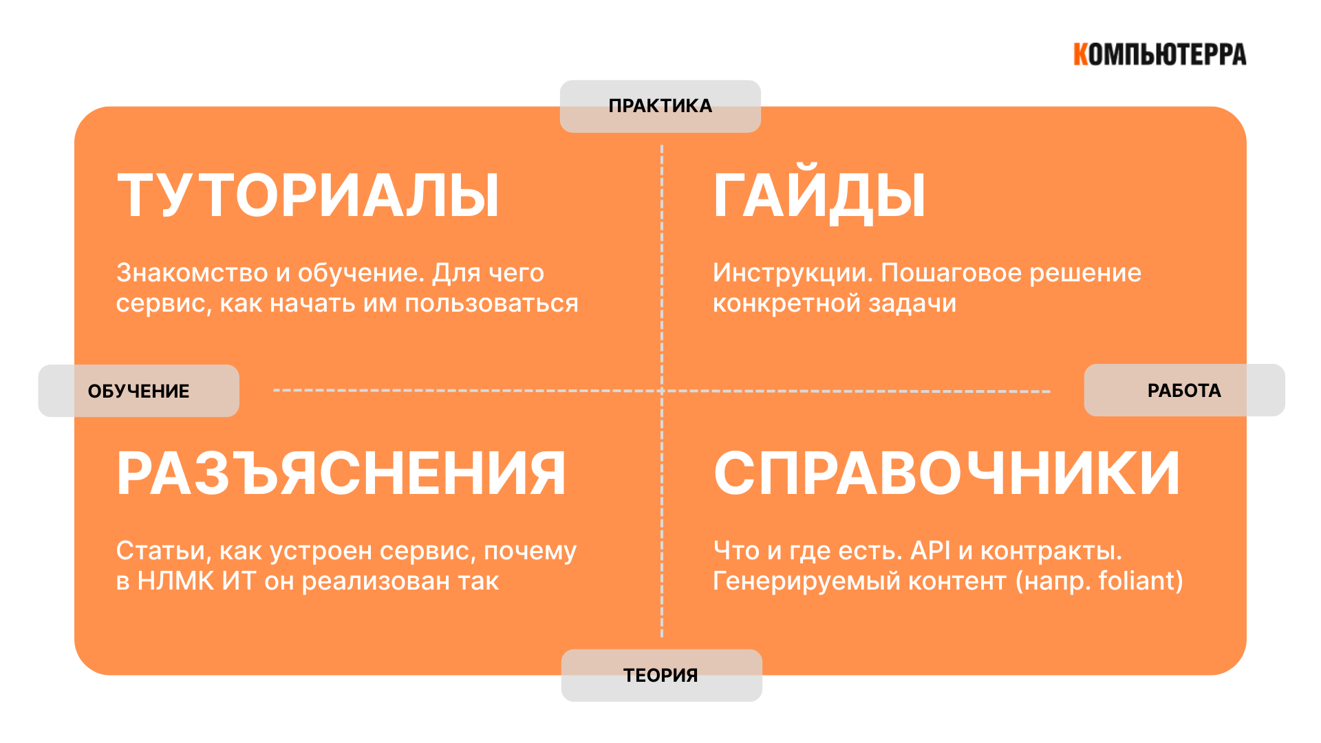 Для каждого сервиса оформили четыре типа материалов. Новичкам предлагались вводные туториалы, позволяющие быстро освоиться. Для типовых задач создавались пошаговые инструкции. Отдельный формат посвящался объяснению принципов работы сервисов в контексте компании, включая причины, почему они отличаются от внешнего опыта. Наконец, поддерживались сухие справочники с API, контрактами и описанием ресурсов.