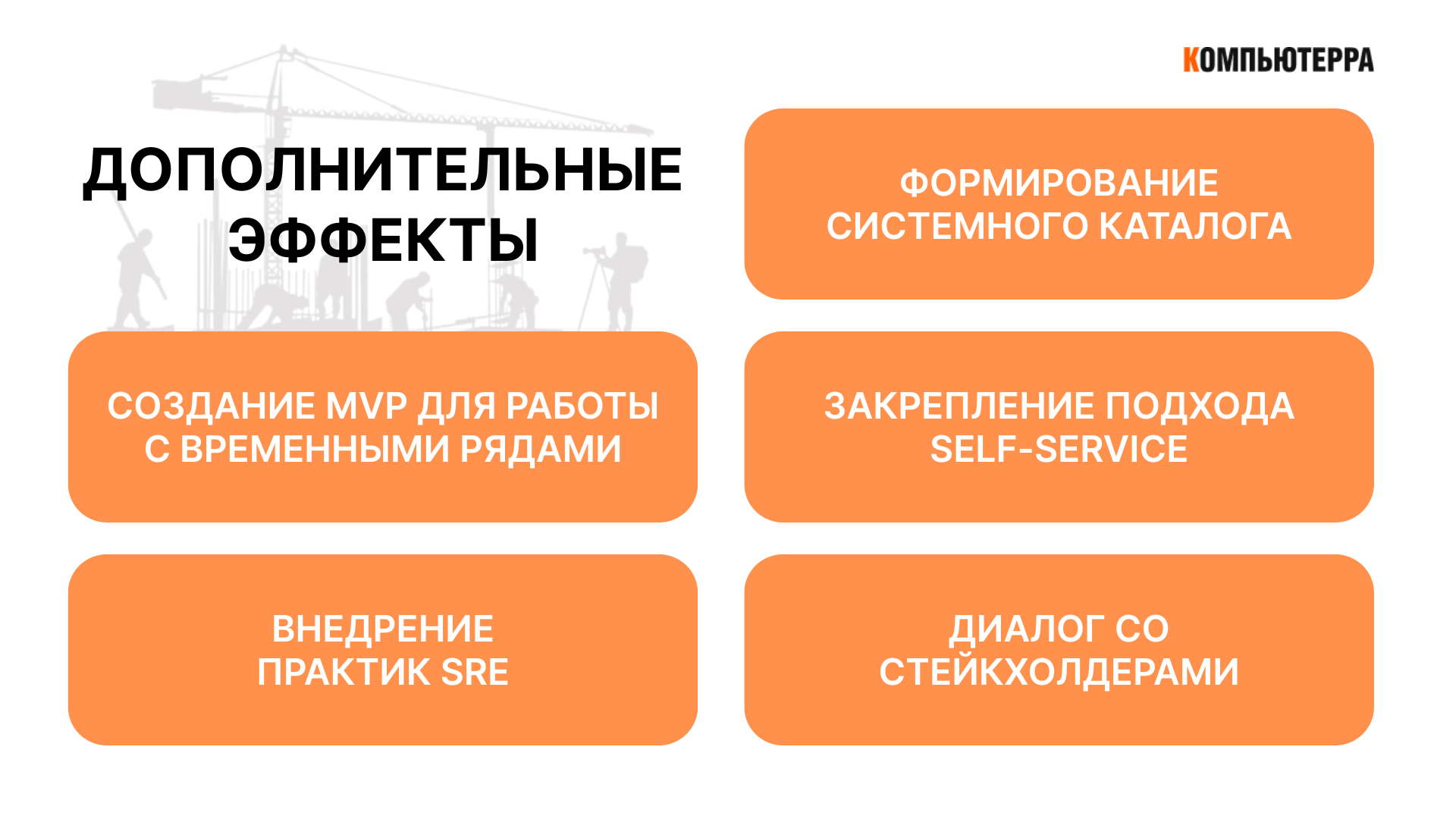 Третьим эффектом стало закрепление подхода self-service. Идея автоматизации и единой точки входа распространилась на разные домены компании, где начали появляться собственные решения для самообслуживания. Это снизило зависимость от ручных операций и ускорило работу команд.