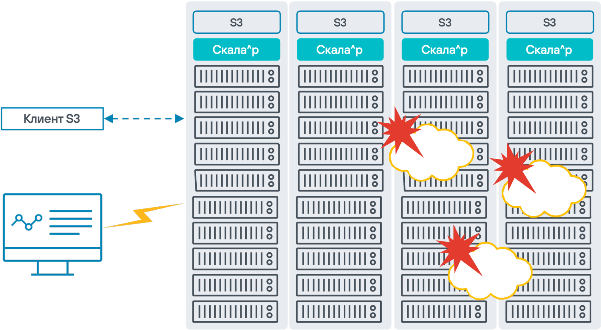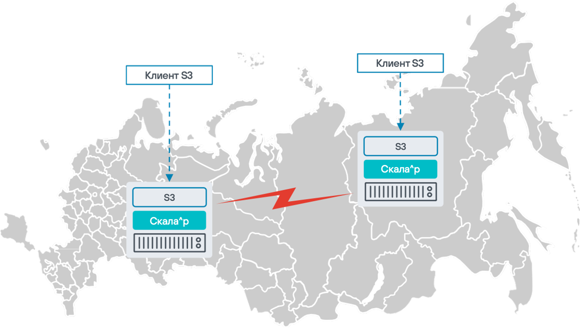 Скала^р МХД.О предлагает встроенные механизмы для обеспечения отказоустойчивости на уровне дата-центров. У пользователей появилась возможность построить кластер высокой доступности (high availability) S3 с помощью НА-балансировщика поверх геореплицированных кластеров.