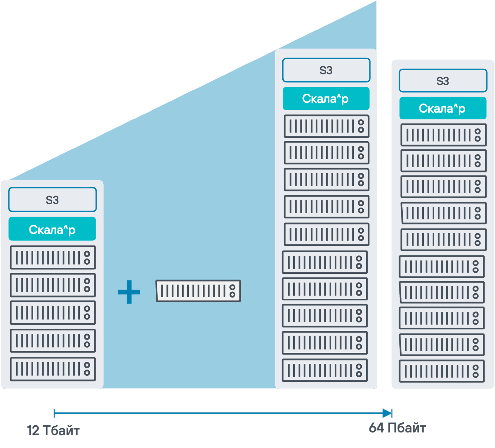 Машина объектного хранилища Скала^р МХД.О — это высокопроизводительный программно-аппаратный комплекс (ПАК) на основе технологии S3, который может резервировать практически неограниченное количество объектов и обеспечивает к ним быстрый доступ.