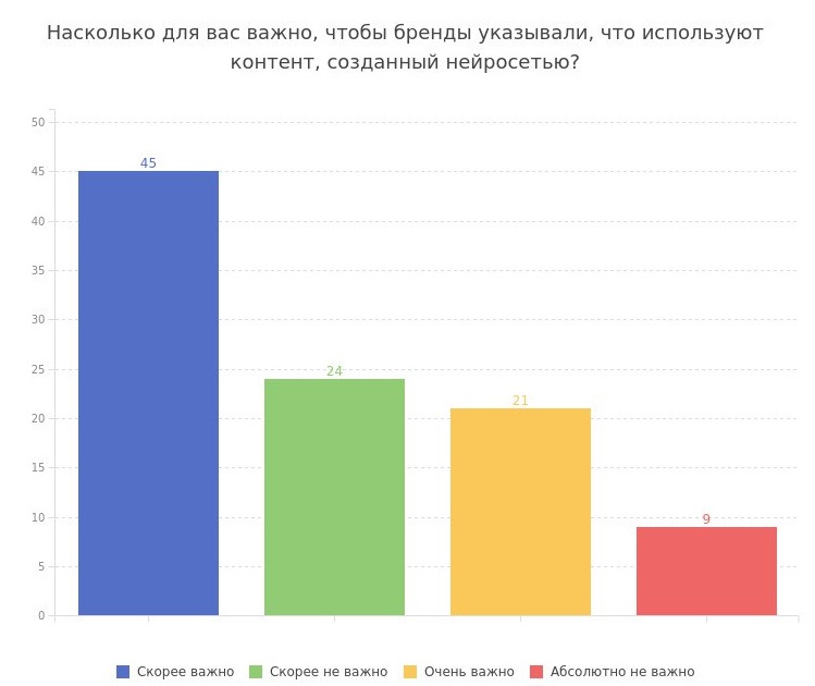По данным сервиса Anketolog.ru , 67% россиян считают необходимым обозначать контент, созданный искусственным интеллектом. При этом почти половина респондентов (43%) положительно относятся к такому контенту, а 47% — нейтрально.