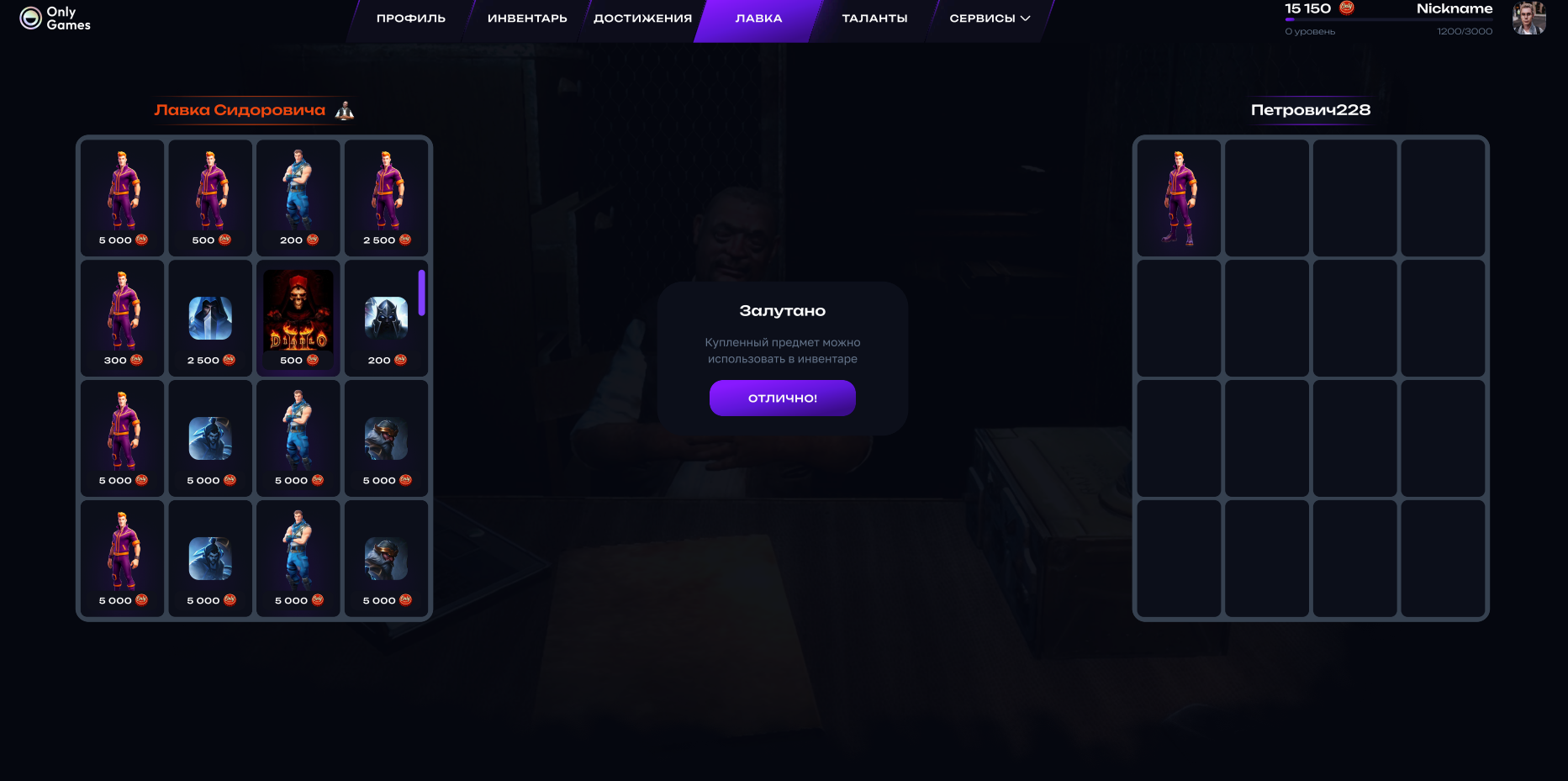 Приобретенные ключи для игр, скины и иные предметы попадают в инвентарь. А в «Лавке Сидоровича» можно купить новые вещи, украсить профиль. Подписка позволяет получить дополнительные преимущества.
