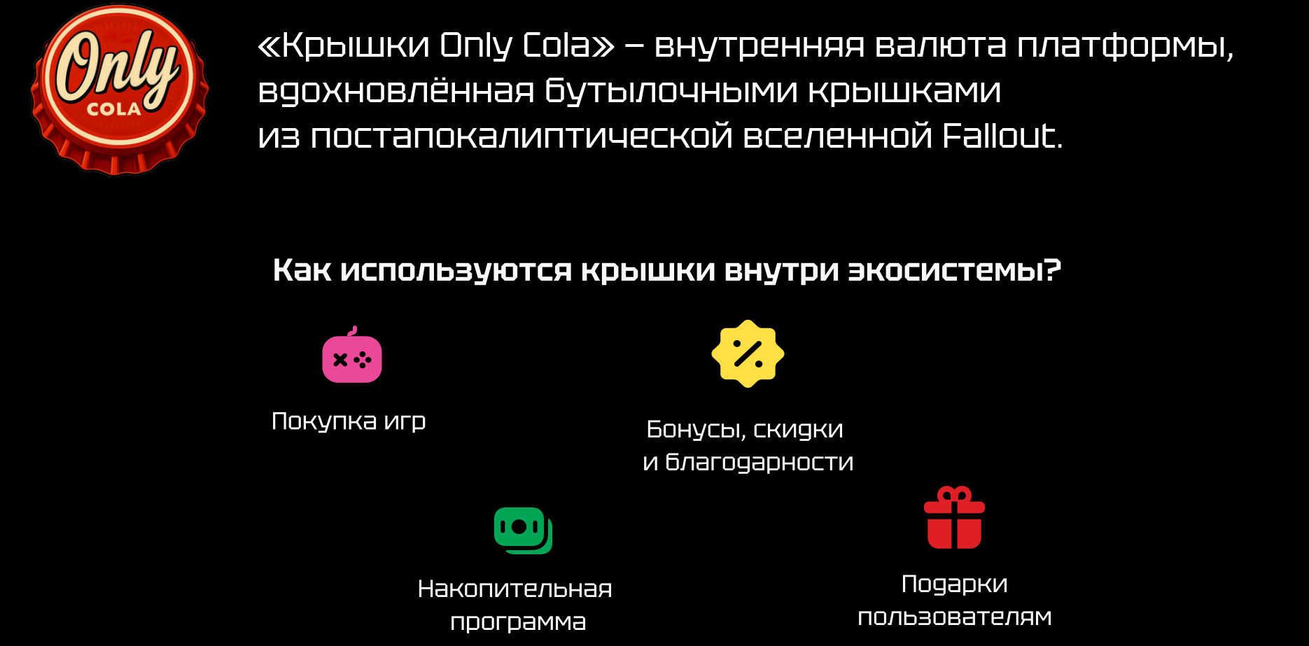 Внутренняя валюта OnlyGames — крышки Only Cola (аналог Nuke Cola из Fallout). Она дает возможность покупать игры, дарить подарки, получать бонусы. Получить валюту можно за участие в активностях: за покупку игр, участие в стриме, победу в киберспортивном турнире.